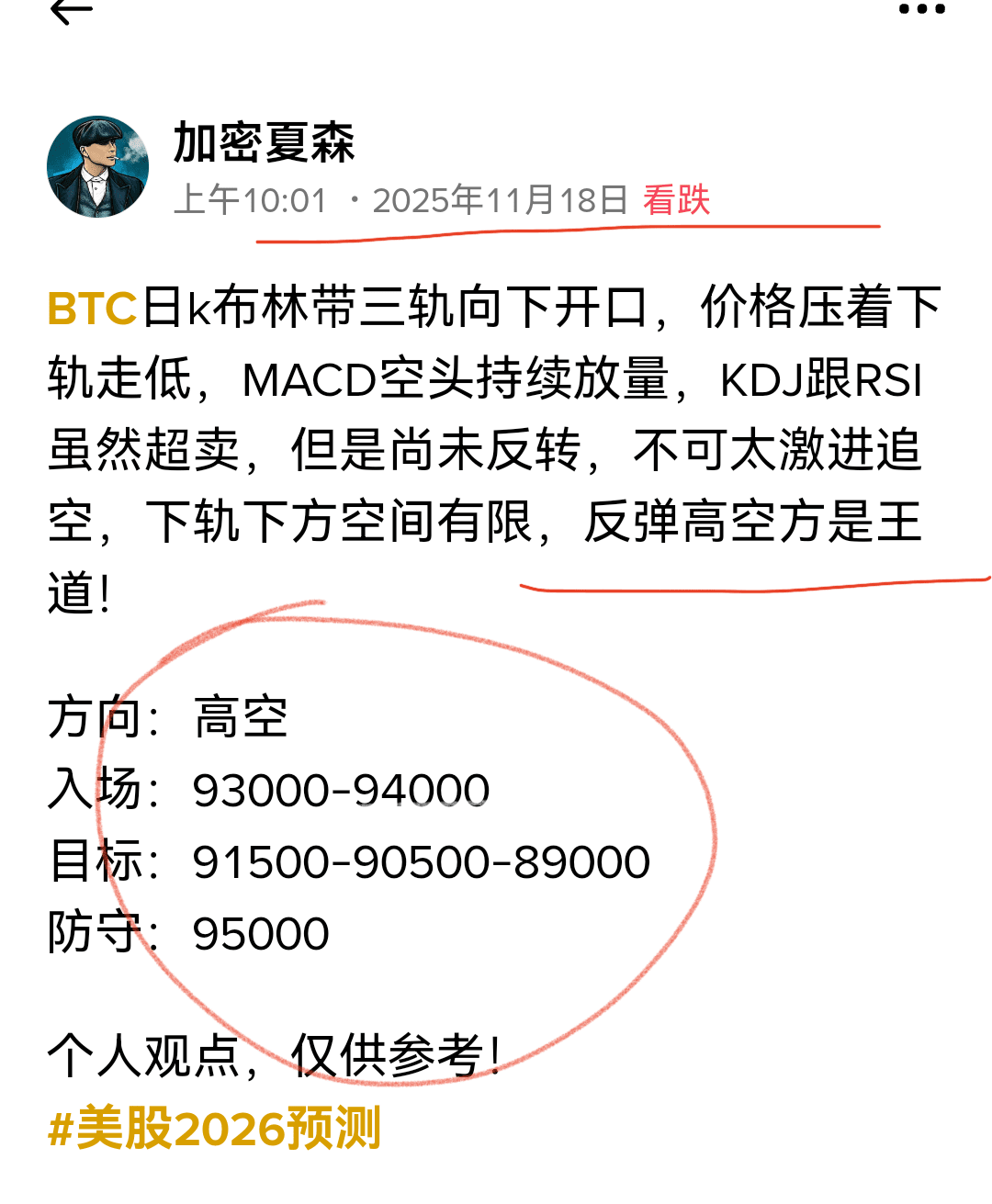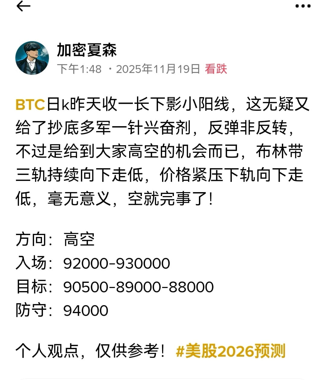 BTC日k昨天收一长下影小阳线,这无疑又给了抄底多军一针兴奋剂,反弹非反转,不过是给到大家高空的机会而已,布林带三轨持续向下走低,价格紧压下轨向下走低,毫无意义,空就完事了! 方向:高空 入场:92000-930000 目标:90500-89000-88000 防守:94000 个人观点,仅供参考!#美股2026预测