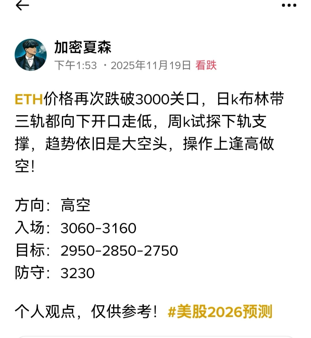 ETH价格再次跌破3000关口,日k布林带三轨都向下开口走低,周k试探下轨支撑,趋势依旧是大空头,操作上逢高做空! 方向:高空 入场:3060-3160 目标:2950-2850-2750 防守:3230 个人观点,仅供参考!#美股2026预测 {future}(BTCUSDT) {future}(ETHUSDT)