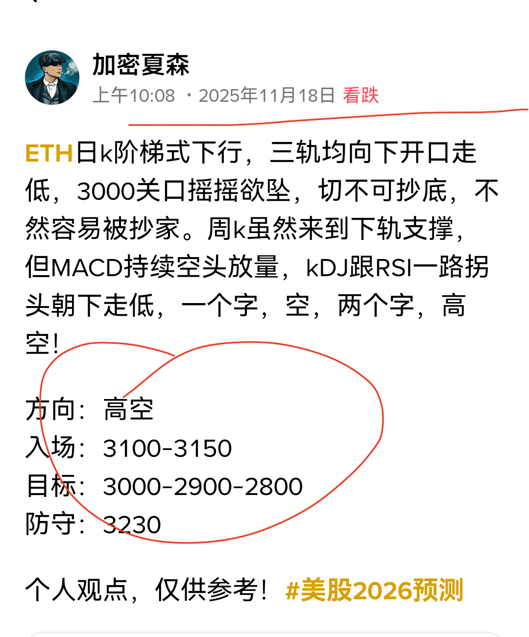 ETH日k阶梯式下行,三轨均向下开口走低,3000关口摇摇欲坠,切不可抄底,不然容易被抄家。周k虽然来到下轨支撑,但MACD持续空头放量,kDJ跟RSI一路拐头朝下走低,一个字,空,两个字,高空! 方向:高空 入场:3100-3150 目标:3000-2900-2800 防守:3230 个人观点,仅供参考!#美股2026预测 {future}(ETHUSDT)