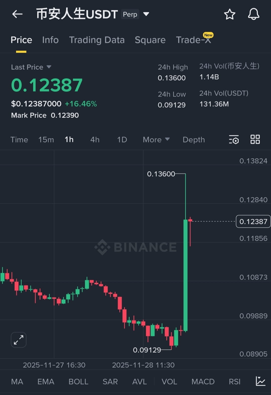 币安人生价格在一根垂直K线内从0.091飙升至0.136!📈💚