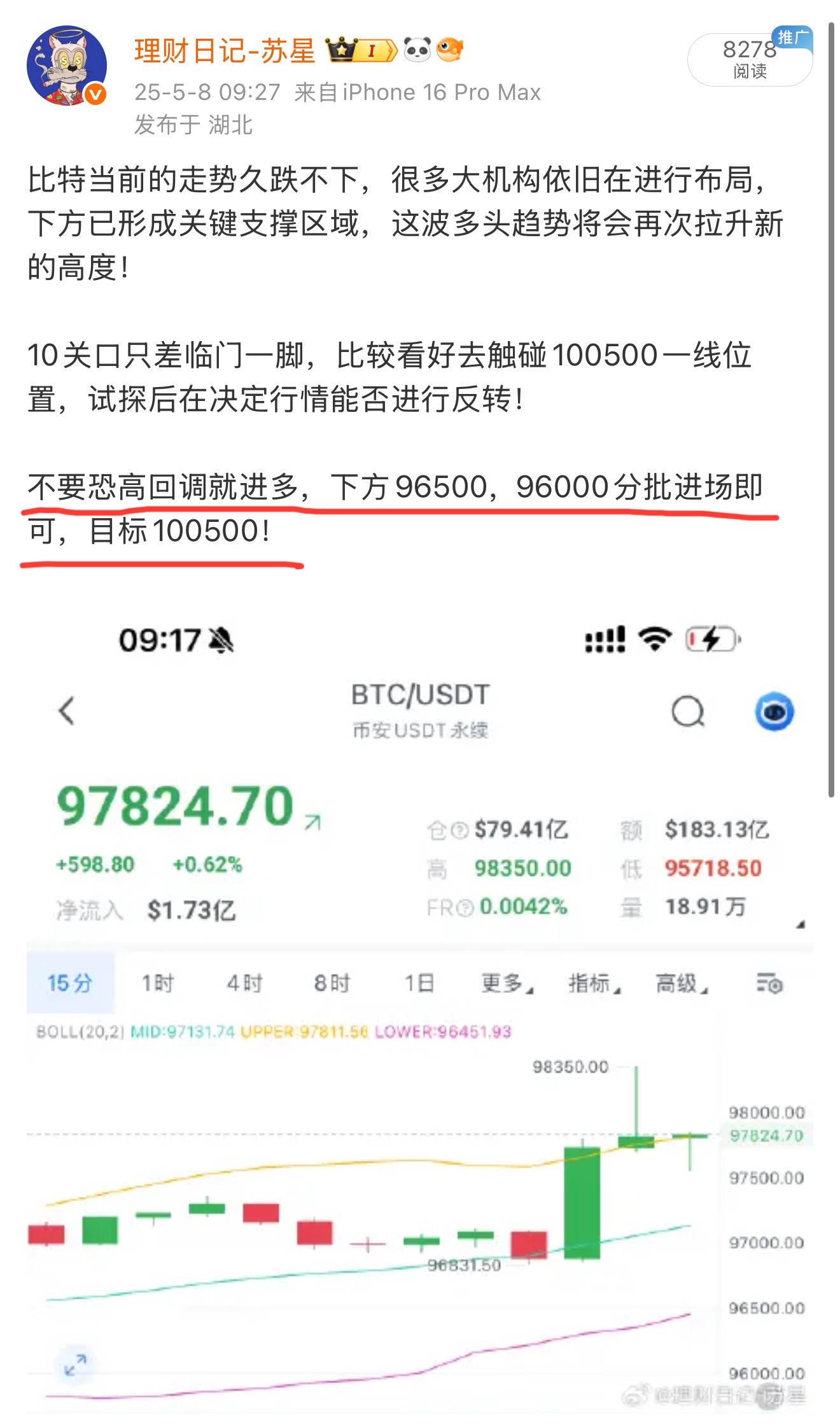 需要提示多少次进多,每天都在给大家明确答案,而你们依旧能被按在地上摩擦! 早间97800公布答案进多,单边上行至99400,1600余点!