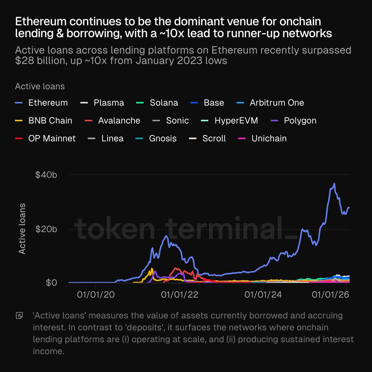 Ethereum remains the dominant on-chain lending platform, leading other networks by approximately 10 times. The total active lending volume across lending platforms on Ethereum recently exceeded $28 billion, representing a roughly 10-fold increase from its low point in January 2023. Major contributor: @aave, with a market share of approximately 70%.