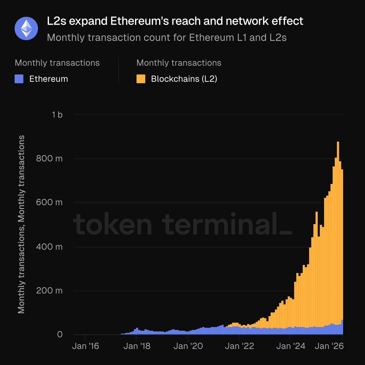 Level 2 tokens expand Ethereum's reach and network effects. Monthly transaction volume of Ethereum Level 1 and Level 2 tokens.