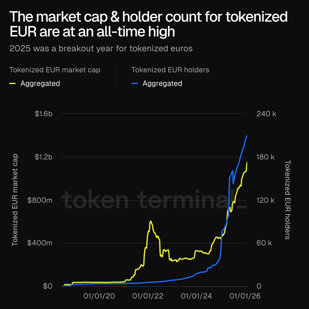 The market capitalization and number of holders of euro tokens have both reached record highs. Everyone is talking about dollar stablecoins, but the euro stablecoin market is equally massive: ⛓️ On-chain euro: Market capitalization $1.15 billion 🧮 Off-chain euro: Market capitalization $16.07 trillion