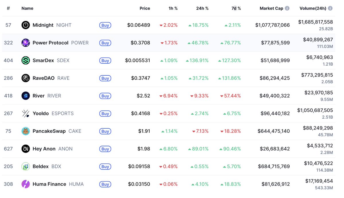 Among the BEP-20 index constituents, MemeCore rose 16%, and @MYX_Finance rose 23.5%, leading the gains.