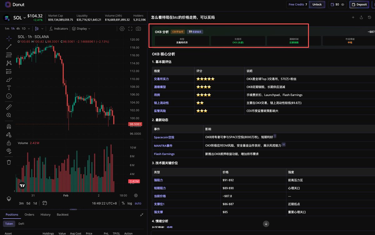 I directly asked Donut (@DonutAI) to analyze the price trend of OKB and casually asked, "As a trading newbie, how should I buy?" Instead of a simple "bullish/bearish" answer, it provided a set of actionable trading suggestions, including position sizing, methods, and risk points. You can feel the difference for yourselves.