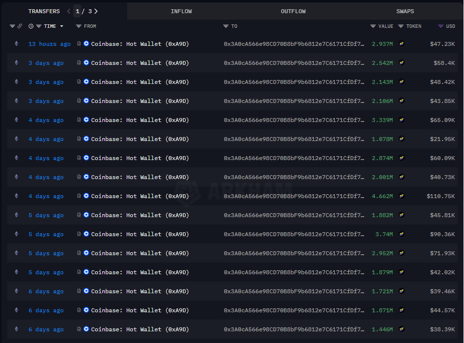 13 小时前,一位名为 0x3A0 的巨鲸从 Coinbase 提现了 294 万枚 RLS(约 4.723 万美元)。 截至目前,他已累计持有 9885.6 万枚 RLS(约 151 万美元),平均入场价约为 0.026 美元,且尚未出售任何 RLS。 地址: