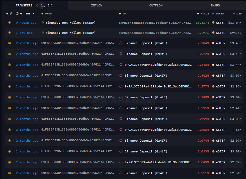 9 小时前,一个钱包(可能是 ASTER 的做市商)从币安 (Binance) 提现了 1343.7 万枚 ASTER 代币(约合 1304 万美元)。 地址: