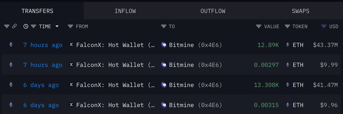 真正的以太坊 (ETH) 策略! 在过去的 7 小时内,#Bitmine 又积累了 33.5 万个 ETH(价值 1.1206 亿美元)。 地址: