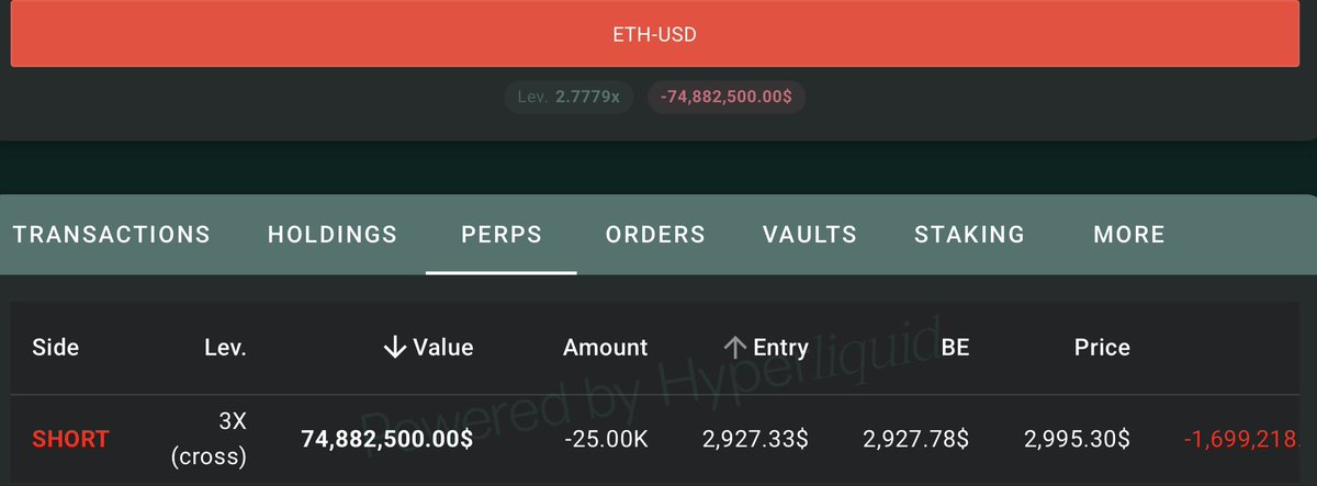 上周,这只巨鲸 0x0dd 开立了 3 笔 $ETH 空头头寸,价值约 7500 万美元。 截至目前,他的未实现亏损约为 170 万美元,清算价格约为 3993 美元。 地址: