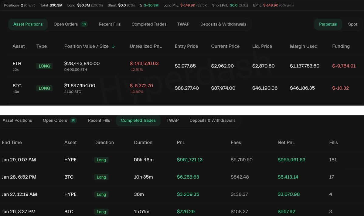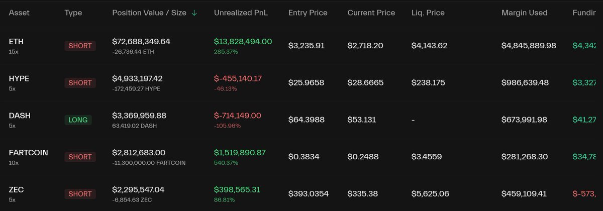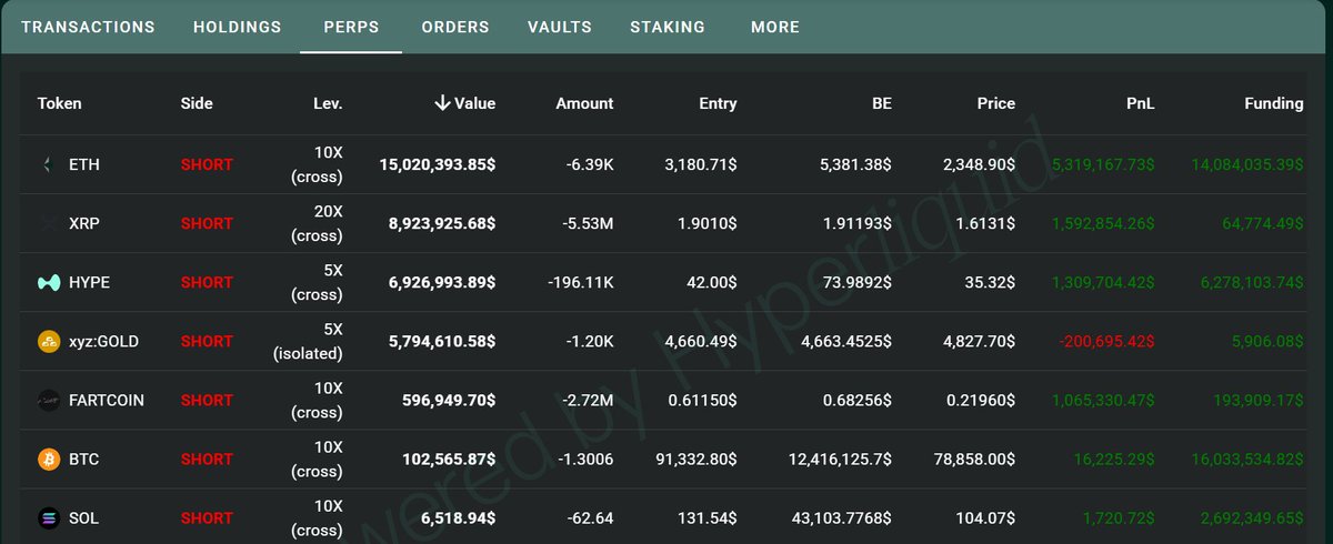 1 小时前,#Abraxas_Capital 开始平仓其 $HYPE 的空头头寸。 目前,他所有空头头寸的未实现利润约为 907 万美元,但他的资金费收益却高达约 3973 万美元。 真是高明的策略! 地址: