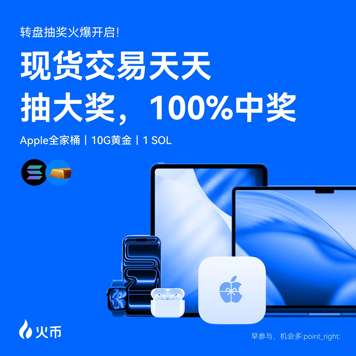 💥 100%中奖!【现货交易大转盘抽奖】又来咯! (对每天交易的火伴来说,这不是顺手的事儿嘛😎 🎁豪华奖池:Apple 全家桶、10g 黄金、 $SOL 等你来拿哦! 💡100%中奖!越早参与机会越多哦👇