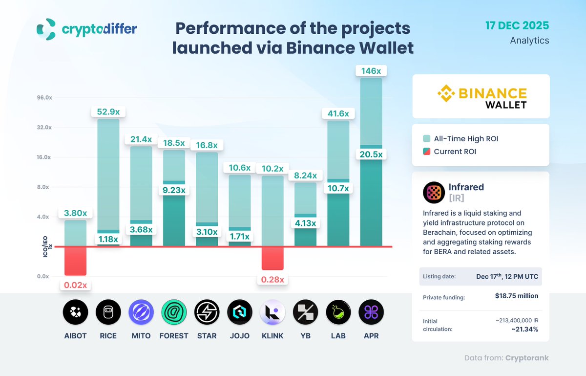 通过 @BinanceWallet 上线的项目表现 @InfraredFinance $IR 现已在 #BinanceWallet 上线。参与需要 Alpha Points,每位用户认购上限为 3 $BNB。 $APR $LAB $YB $KLINK $JOJO $STAR $FOREST $MITO $RICE $AIBOT