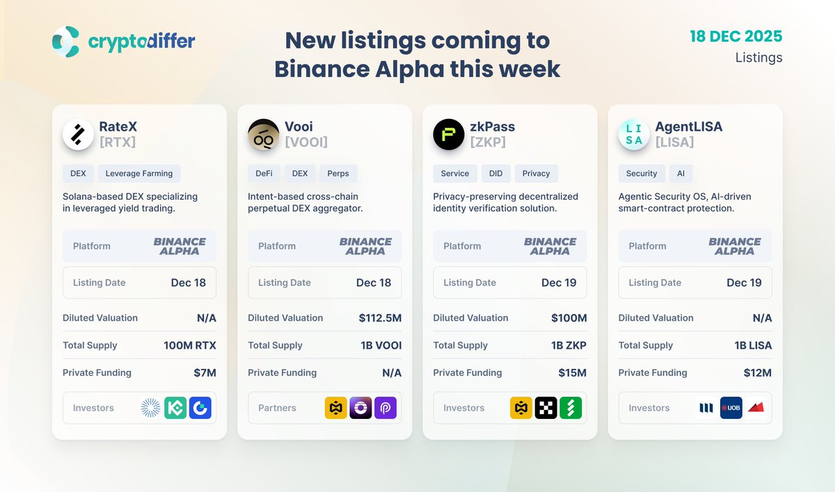 本周 @Binance Alpha 将上线四项新币 #Binance Alpha 即将上线四项新币,包括 #RateX $RTX、#Vooi $VOOI、#zkPass $ZKP 和 #AgentLISA $LISA。每个项目都专注于快速增长的领域,例如 #Perps(恶意攻击)、杠杆挖矿和安防。