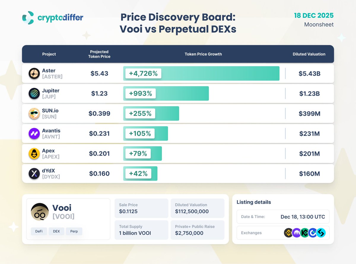 价格发现板:@Vooi_io $VOOI 该平台总供应量为 10 亿,估值 1.12 亿美元,此图表基于 @Apex、@dYDx 和 @Avantis 等类似的永续合约去中心化交易所 (DEX),对潜在市场情景进行基准分析。计划于 12 月 18 日 13:00 UTC 上线。