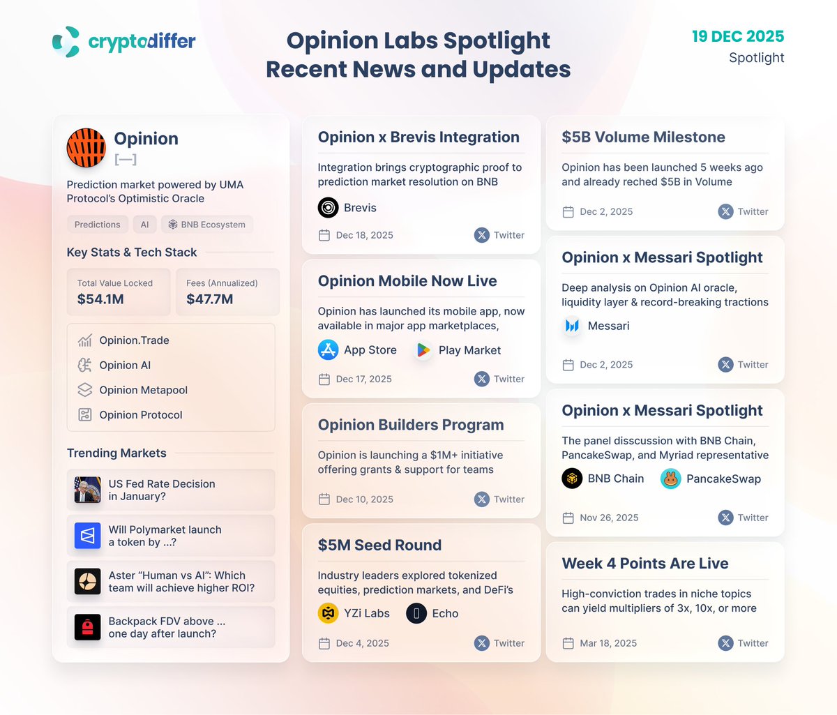 Opinion Labs 聚焦。最新消息及更新 @opinionlabsxyz 凭借强劲的平均交易量和不断增长的平台用户量,跻身三大预测平台之列。#积分计划 现已上线,该项目还获得了 @YZilabs 和 #BNB 链的支持。