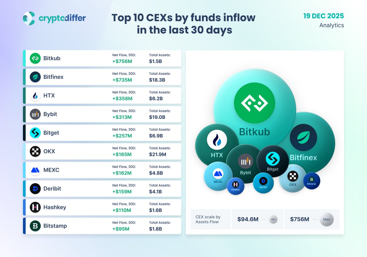 过去 30 天资金流入量排名前十的中心化交易所 (CEX) #Bitkub 领跑 #CEX 资金流入榜,吸引了 7.56 亿美元的新资产。数据显示,大型 #交易所 的资金流入面临压力,这为小型交易所本月抢占市场份额创造了机会。$HT $BGB $OKB $MX $HSK