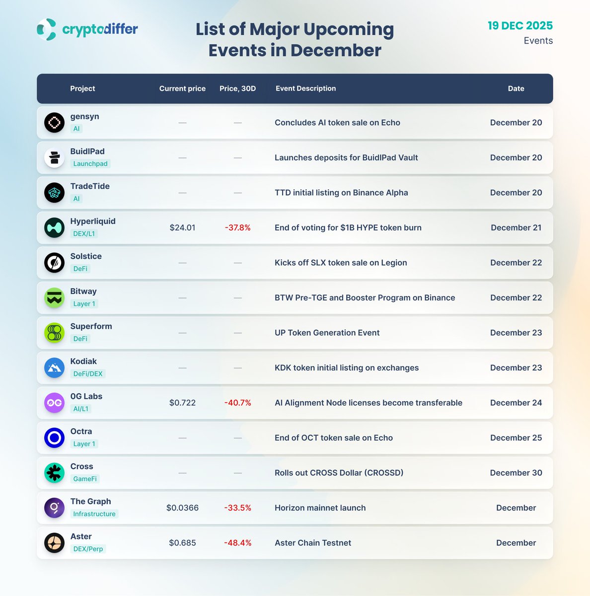 十二月即将举办的重大活动! 即将举办的重大活动完整列表(持续更新) 👉 $AI $HYPE $SLX #0G $UP $OCT $KDK $ASTER $GRT