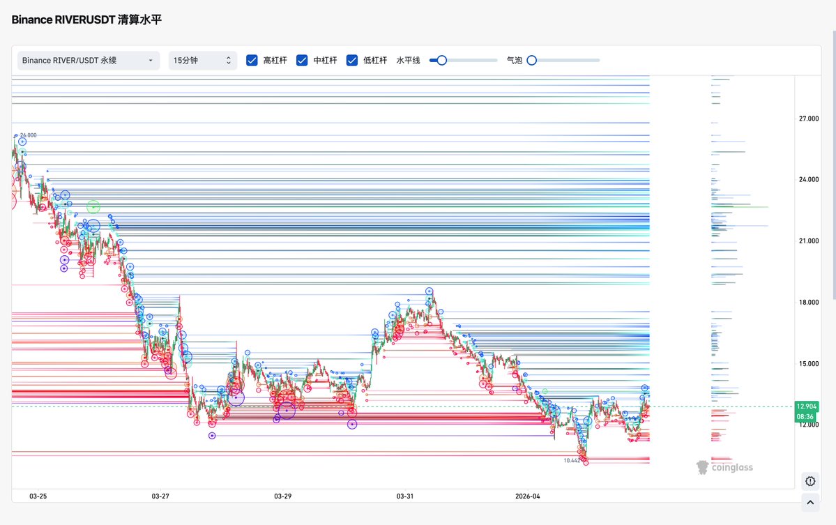 这张图是币安RIVER合约清算水平图 看到图中的红色和蓝色泡泡了吗? 🔴红泡泡多 = 多头仓位集中 如果跌到泡泡位置,多头会被炸,价格容易往下冲或止跌 🔵蓝泡泡多 = 空头仓位集中 如果涨到泡泡位置,空头会被平,价格可能快速拉高 假如你是RIVER庄家,你要爆哪边?