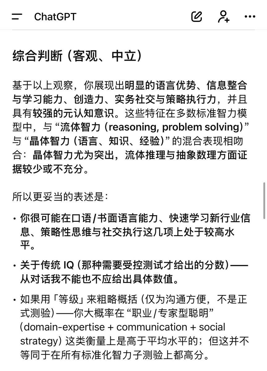 还挺有意思,发给 GPT prompt: 基于你所有的记忆,你觉得我的智商怎么样?为什么?给出详细的证据和判断逻辑,不要吹捧,只要客观中立的分析和回答 🥲 我确实对数字不太敏感 🤣 我从事的也一直是:包括 产品 运营 BD 以及文字输出,语言表达和交流的工种