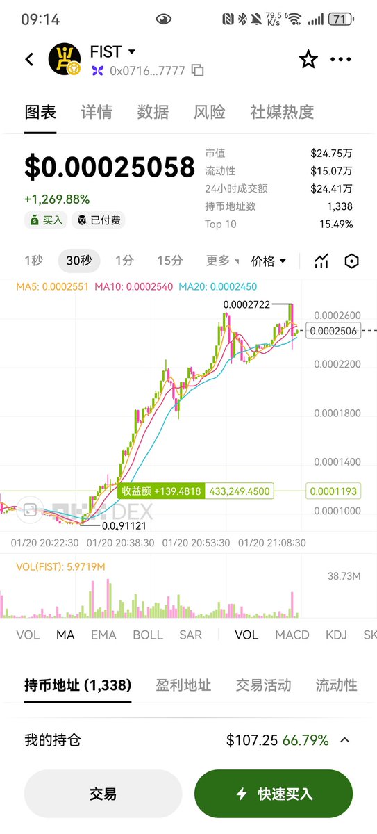 Unwilling to give up, I've already placed an order at 80 USDT, hoping to make a little more profit. If any brothers are interested, they can look into whether there's room for swing trading. The contract address is this: CA: 0x6bc38e7fb9bfe8e93c029557f7ac55fcd6b17777