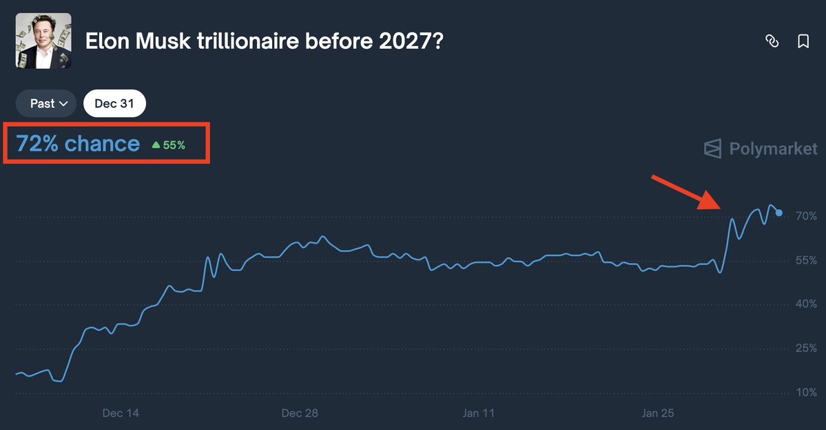 Musk is just one step away from a trillion dollars! SpaceX's acquisition of xAI has instantly boosted bullish sentiment! A 72% chance of reaching the top this year, a historic wealth explosion! 2026: either witness a miracle or watch the bears suffer a crushing defeat! Brothers, believe in his meteoric rise, or gamble on his downfall? 👇