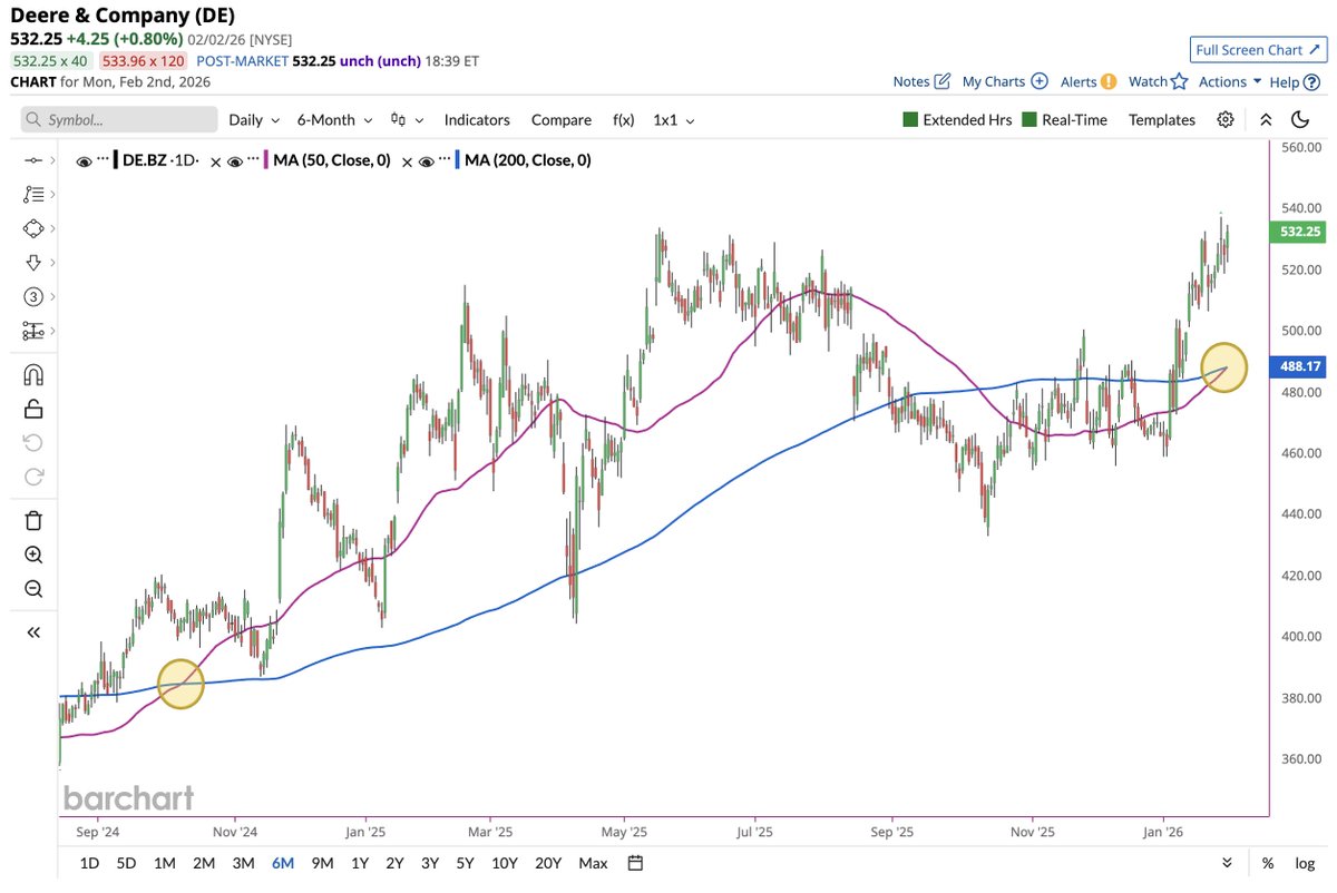 John Deere's $DE index has formed a golden cross! 🚨 A once-in-a-decade signal; the last time it surged 32%. Is this agricultural machinery giant about to become the engine of a bull market? Is this a return to value, or a trap set by market manipulators? 👇