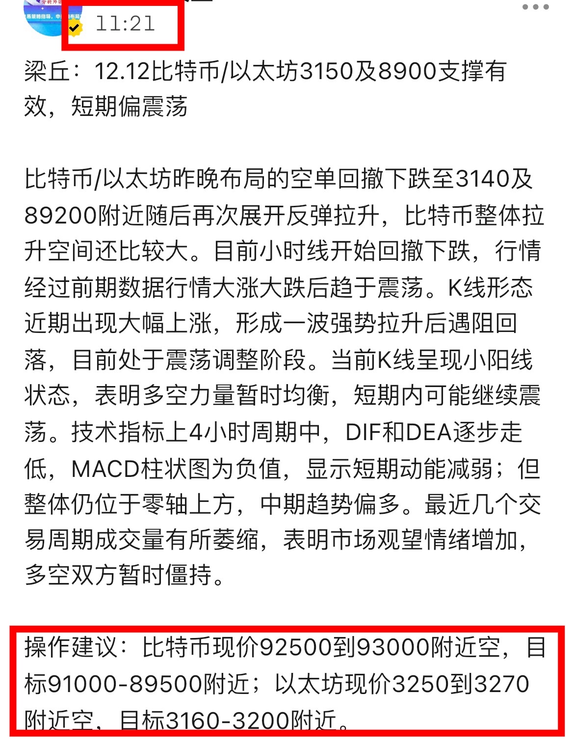 比特币/以太坊昨日高位92500及3250上方布局的箜丹思路,凌晨空单止盈后紧接着多单进场,整体空间还不错。目前行情自低点反弹后横盘震荡,多空延续性不强。K线形态上呈现明显的暴跌后震荡修复走势,日K线在出现长下影线,表明下方存在一定买盘支撑,但反弹力度有限。技术指标上4小时周期中,DIF和DEA均处于零轴下方,MACD柱状图为负值且缩短,显示空头力量减弱。