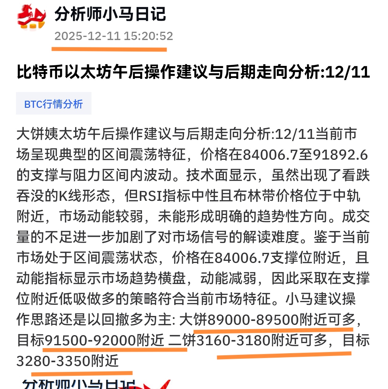 大饼姨太坊昨日布局多单大获全胜:12/12昨日午后看多思路再次得到验证,我们看多思路给的点位大饼先关注89500一线,以太关注3180一线,大饼凌晨拉升到93000一线超预期到达目标位我们及时出场,二饼到达3270一线目标位也同时出场,因为防止回弹所以先落袋为安,航情走向还是非常符合预期的,像这样的航情无论做多做空都可以拿点,最主要的看自己的进场点位,那么小马在布局中大饼斩获近3500余点空间,以太同步拿90余点空间,按照策略走的朋友肯定吃肉的,小马所有的思路都是提前给到,点位都是提前公开,并有迹可寻的。
