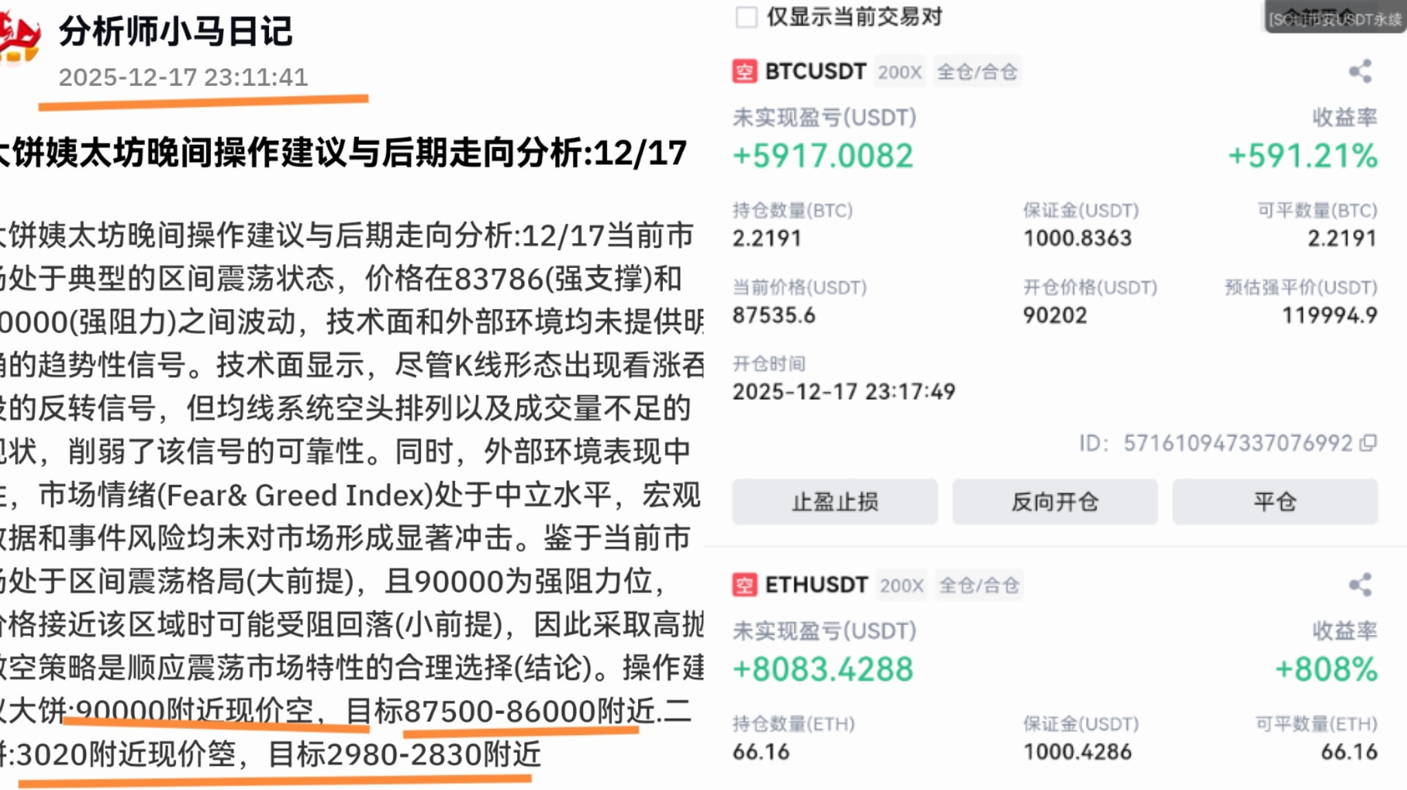 大饼姨太坊晚间布局空单大获全胜:12/18晚间现价看空思路再次得到验证,我们看空思路给的点位大饼先关注90000一线,以太关注3020一线,大饼凌晨瀑布试下跌到86200一线到达目标位附近我们及时出场,二饼到达3232一线目标位也同时出场,因为防止回弹所以先落袋为安,航情走向还是非常符合预期的,像这样的航情无论做多做空都可以拿点,最主要的看自己的进场点位,那么小马在布局中大饼斩获近4000余点空间,以太同步拿近200余点空间,按照策略走的朋友肯定吃肉的,小马所有的思路都是提前给到,点位都是提前公开,并有迹可寻的。(目标点位2980是输入错误大家谅解)