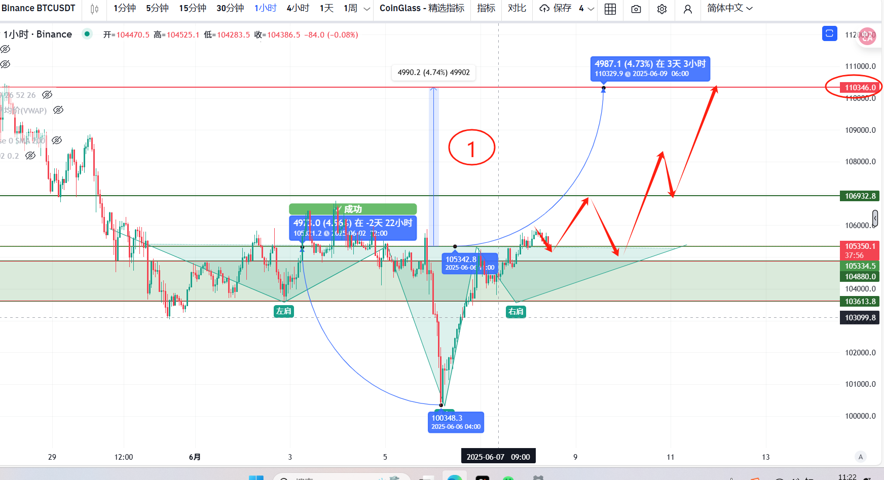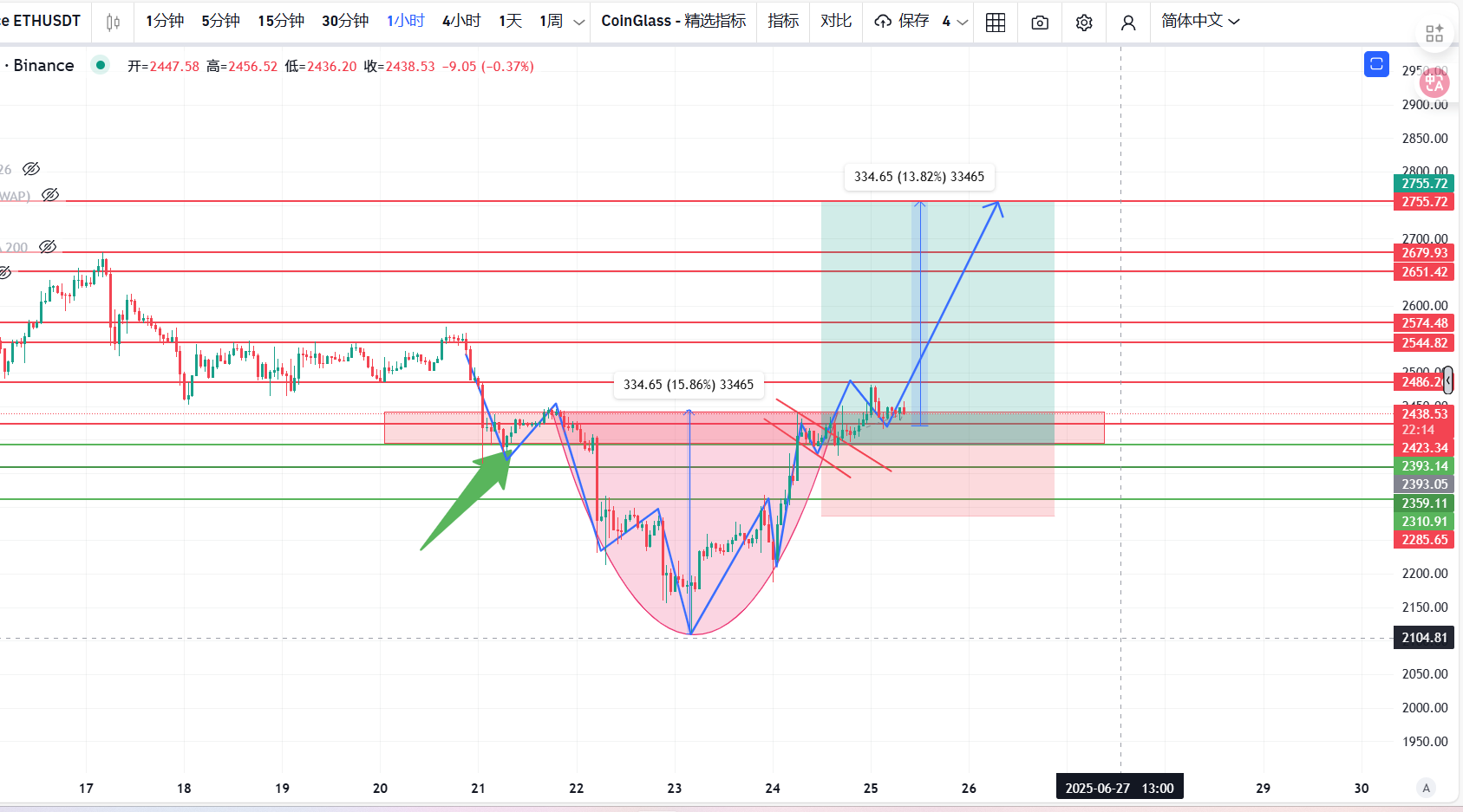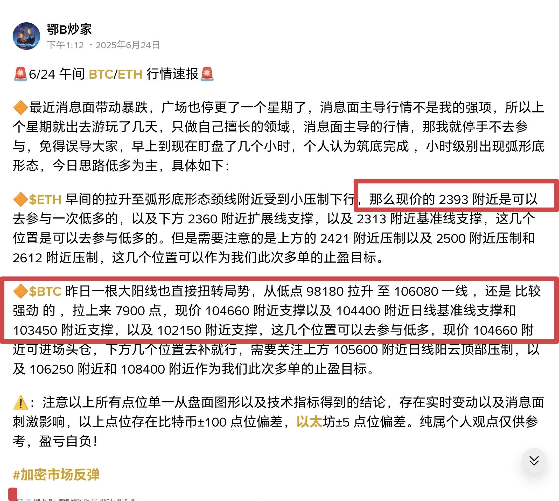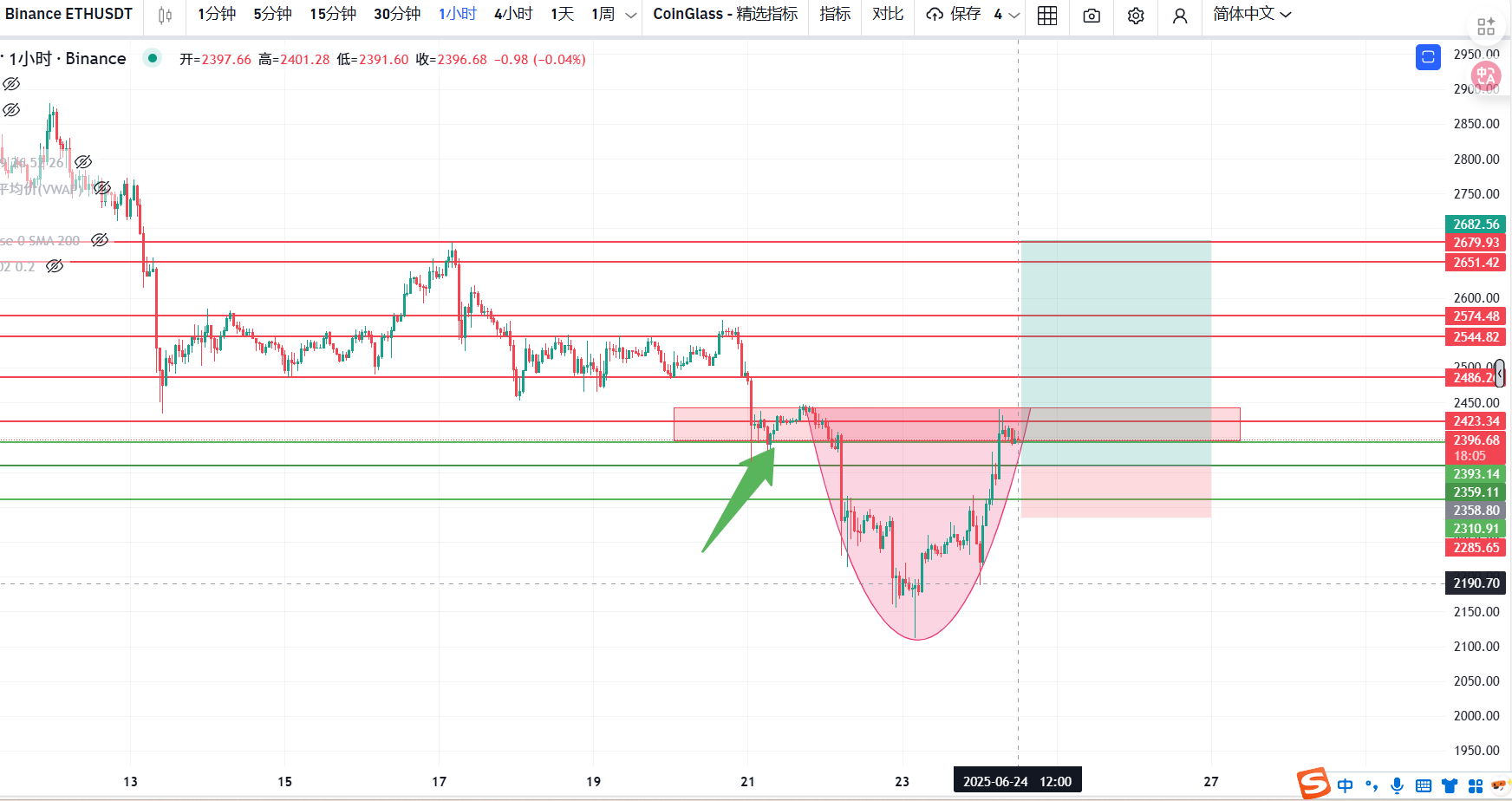 🚨6/24 午间 BTC/ETH 行情速报🚨 🔶最近消息面带动暴跌,广场也停更了一个星期了,消息面主导行情不是我的强项,所以上个星期就出去游玩了几天,只做自己擅长的领域,消息面主导的行情,那我就停手不去参与,免得误导大家,早上到现在盯盘了几个小时,个人认为筑底完成 ,小时级别出现弧形底形态,今日思路低多为主,具体如下: 🔶$ETH 早间的拉升至弧形底形态颈线附近受到小压制下行,那么现价的 2393 附近是可以去参与一次低多的,以及下方 2360 附近扩展线支撑,以及 2313 附近基准线支撑,这几个位置是可以去参与低多的。但是需要注意的是上方的 2421 附近压制以及 2500 附近压制和 2612 附近压制,这几个位置可以作为我们此次多单的止盈目标。 🔶$BTC 昨日一根大阳线也直接扭转局势,从低点 98180 拉升 至 106080 一线 ,还是 比较 强劲 的 ,拉上来 7900 点,现价 104660 附近支撑以及 104400 附近日线基准线支撑和 103450 附近支撑,以及 102150 附近支撑,这几个位置可以去参与低多,现价 104660 附近可进场头仓,下方几个位置去补就行,需要关注上方 105600 附近日线阳云顶部压制,以及 106250 附近和 108400 附近作为我们此次多单的止盈目标。 ⚠️:注意以上所有点位单一从盘面图形以及技术指标得到的结论,存在实时变动以及消息面刺激影响,以上点位存在比特币±100 点位偏差,以太坊±5 点位偏差。纯属个人观点仅供参考,盈亏自负! #加密市场反弹