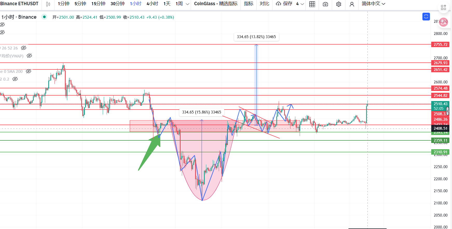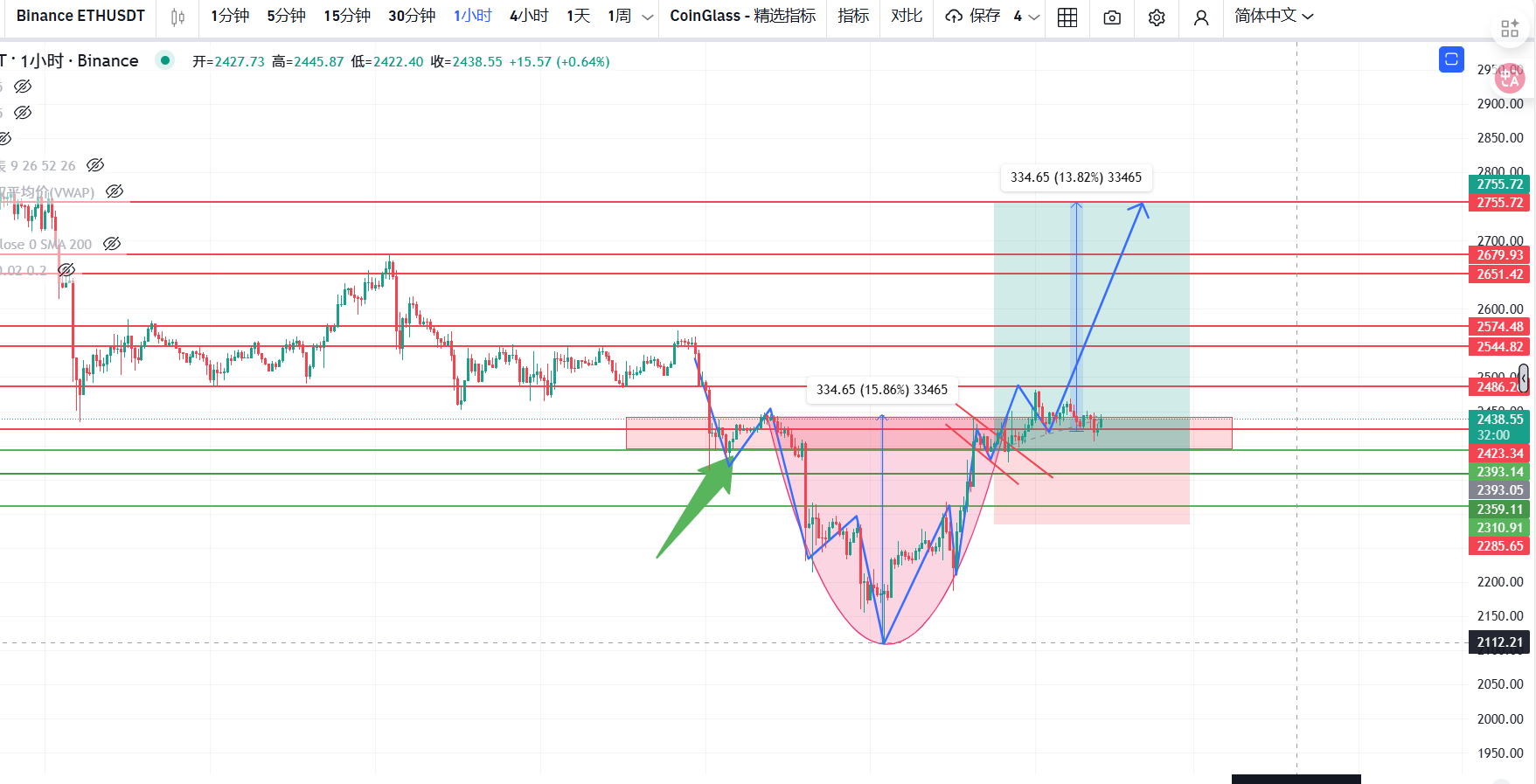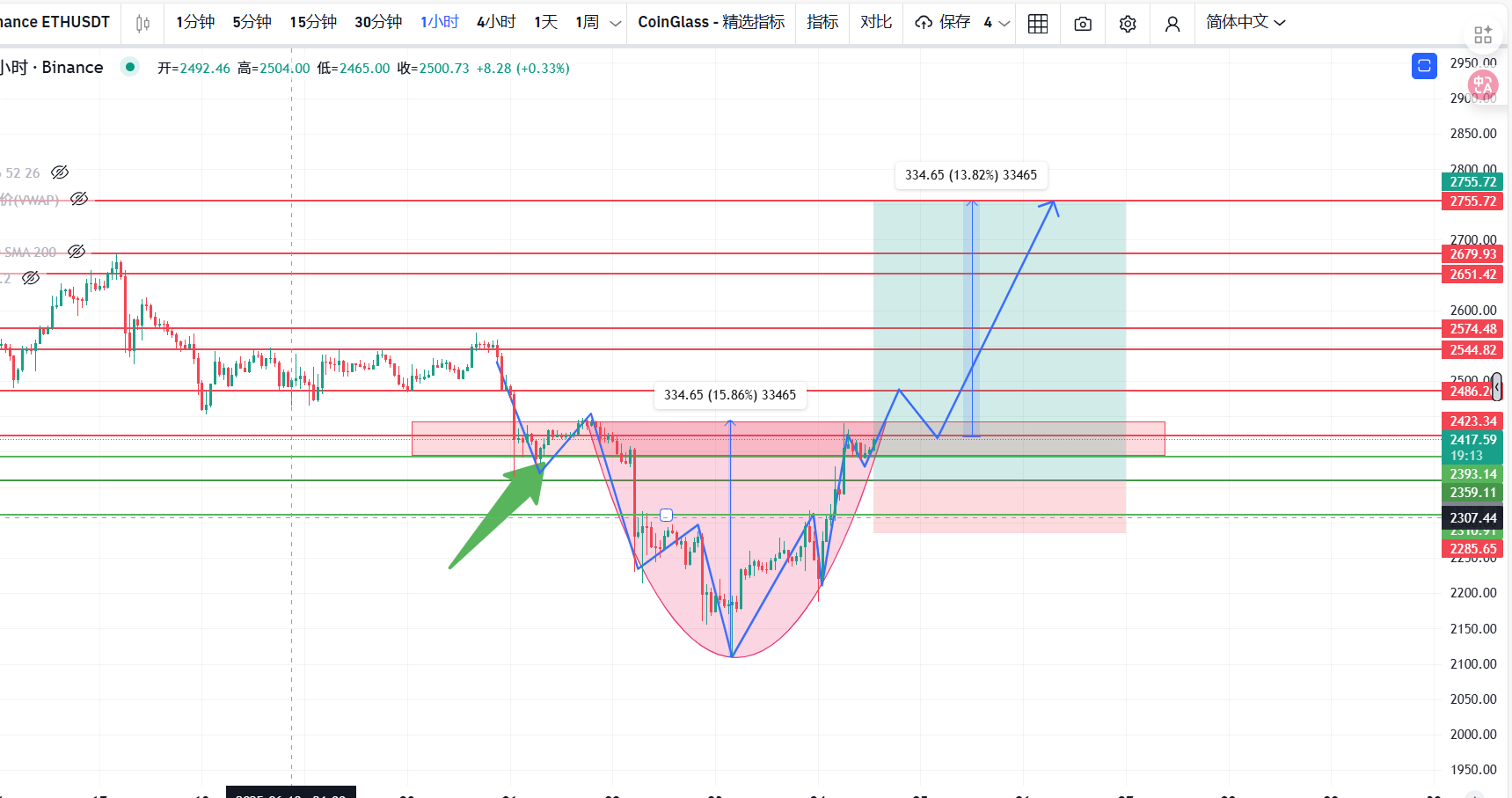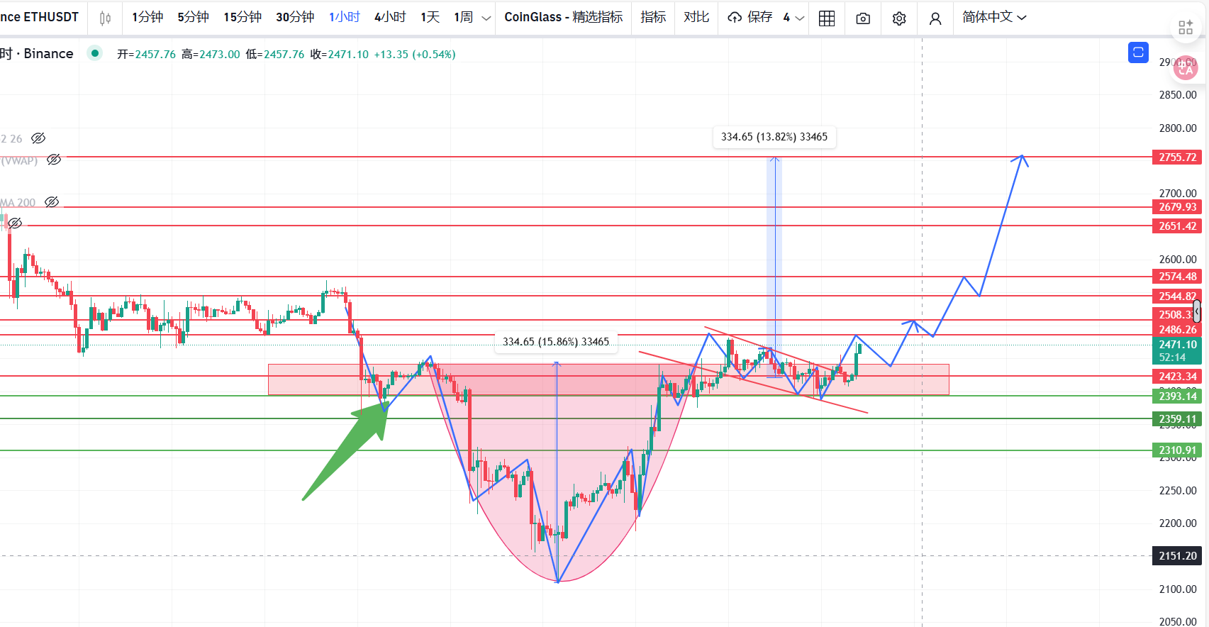 🚨4/25 早间 BTC/ETH 行情速报🚨 🔶终究还是上来了,昨日也提到以太走出弧形底形态,即将继续拉升,文章中也是有提到让大家 2393 一线直接多,是比较符合预期的,后续行情基本跟提前画好的预判走势图一致,触及 2480 附近开始受压回测至 2420 附近开始得到支撑继续上行,(图二对比图三可以看出)个人认为现在该测试的点位已经测试,那么现在就是突破的时候了,多单在手的就耐心等待吧! 🔶大饼昨日文章中也提到让大家 104660 附近直接多,后续最低也只来到 104648 一线即刻开始反弹至 106488 附近,所以期间 也是将近 2000 点的利润空间的,就就是不知道大家把握住了没有呢?今日还是看好多头! 🔶$ETH 发文期间行情已经走上来了,现价 2460 附近,现在继续关注 2500 附近压制即可,2480 附近昨日受压一次,今日应该会直接突破上去,可能会在 2505 附近再次受压一次。今日操作上 2393 附近多单在手的那就该减仓的减仓,剩下的继续持有即可,空仓的话就关注上方 2500 附近的测压情况,能有效压制就去下方 2420~2360~2310 附近继续去埋伏多单,目标可以去关注上方的几个压制位 2480~2500~2610~2800 附近抵达目标即可减仓继续去博弈 🔶$BTC 日线级别现在价格已经突破布林中轨,也已经击破阳云顶部那么 1 0 5 6 0 0 附近这里可能就会成为新的支撑点,以及下方的 104530 附近基准线支撑,以及 103300 附近支撑,这些位置是可以去参与一下多单的,上方压制位可以作为我们的止盈目标,上方 106300~107800~108400 附近抵达目标即可减仓继续去博弈 ⚠️:注意以上进出场点位单一通过盘面图形以及技术指标得到的结论,存在实时变动以及消息面刺激影响,以及点位存在比特币±100 点位偏差,以太坊±5 点位偏差,以上纯属个人观点仅供参考盈亏自负!
