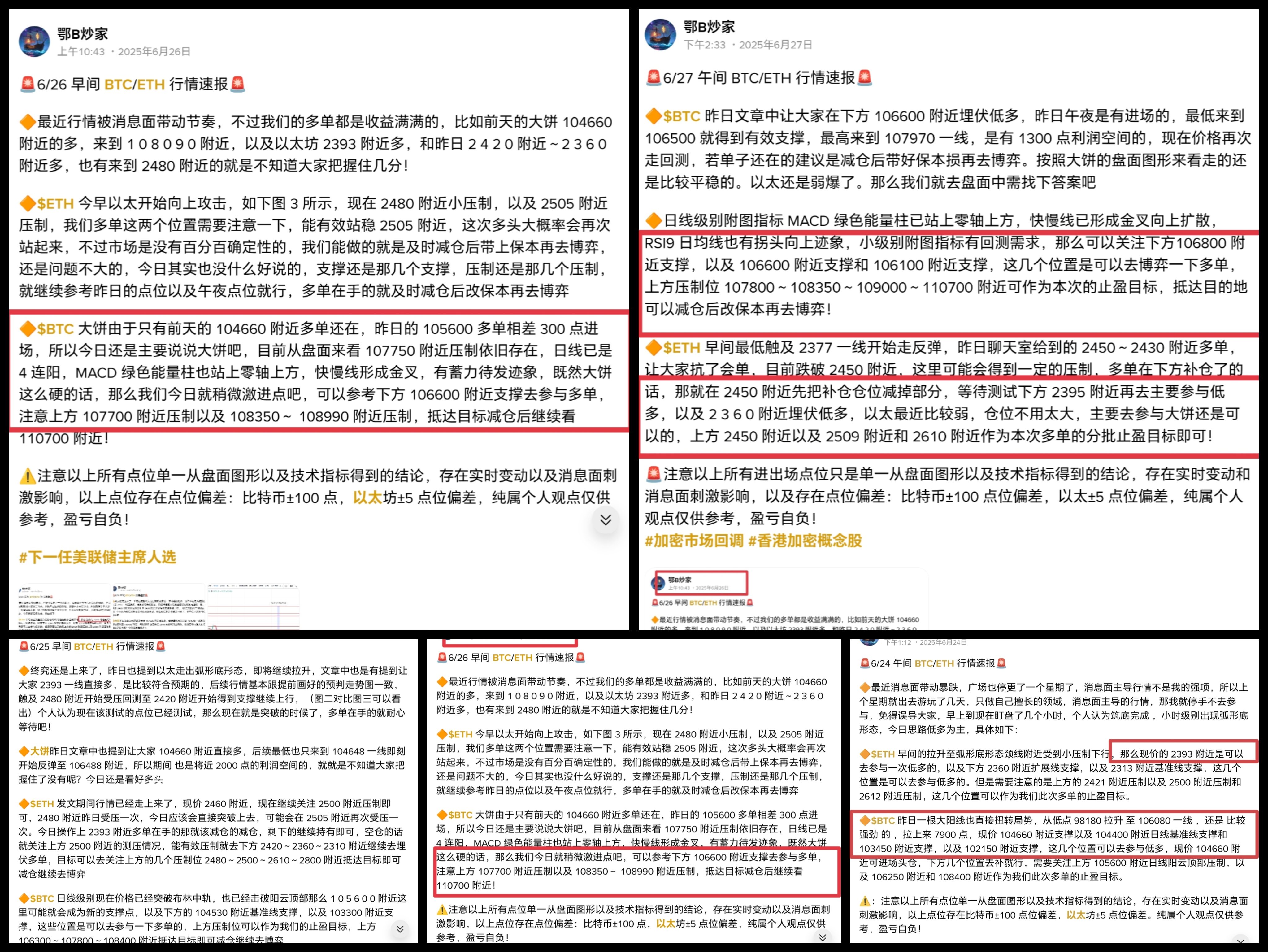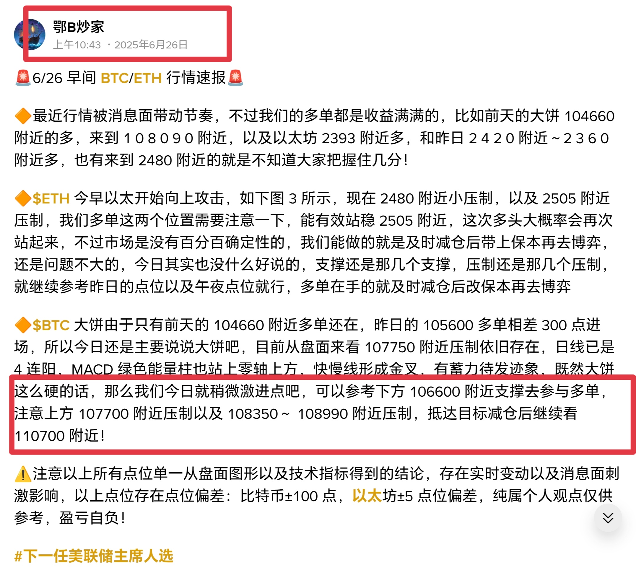 🚨6/26 早间 BTC/ETH 行情速报🚨 🔶最近行情被消息面带动节奏,不过我们的多单都是收益满满的,比如前天的大饼 104660 附近的多,来到 1 0 8 0 9 0 附近,以及以太坊 2393 附近多,和昨日 2 4 2 0 附近~2 3 6 0 附近多,也有来到 2480 附近的就是不知道大家把握住几分! 🔶$ETH 今早以太开始向上攻击,如下图 3 所示,现在 2480 附近小压制,以及 2505 附近压制,我们多单这两个位置需要注意一下,能有效站稳 2505 附近,这次多头大概率会再次站起来,不过市场是没有百分百确定性的,我们能做的就是及时减仓后带上保本再去博弈,还是问题不大的,今日其实也没什么好说的,支撑还是那几个支撑,压制还是那几个压制,就继续参考昨日的点位以及午夜点位就行,多单在手的就及时减仓后改保本再去博弈 🔶$BTC 大饼由于只有前天的 104660 附近多单还在,昨日的 105600 多单相差 300 点进场,所以今日还是主要说说大饼吧,目前从盘面来看 107750 附近压制依旧存在,日线已是 4 连阳,MACD 绿色能量柱也站上零轴上方,快慢线形成金叉,有蓄力待发迹象,既然大饼这么硬的话,那么我们今日就稍微激进点吧,可以参考下方 106600 附近支撑去参与多单,注意上方 107700 附近压制以及 108350~ 108990 附近压制,抵达目标减仓后继续看 110700 附近! ⚠️注意以上所有点位单一从盘面图形以及技术指标得到的结论,存在实时变动以及消息面刺激影响,以上点位存在点位偏差:比特币±100 点,以太坊±5 点位偏差,纯属个人观点仅供参考,盈亏自负!
