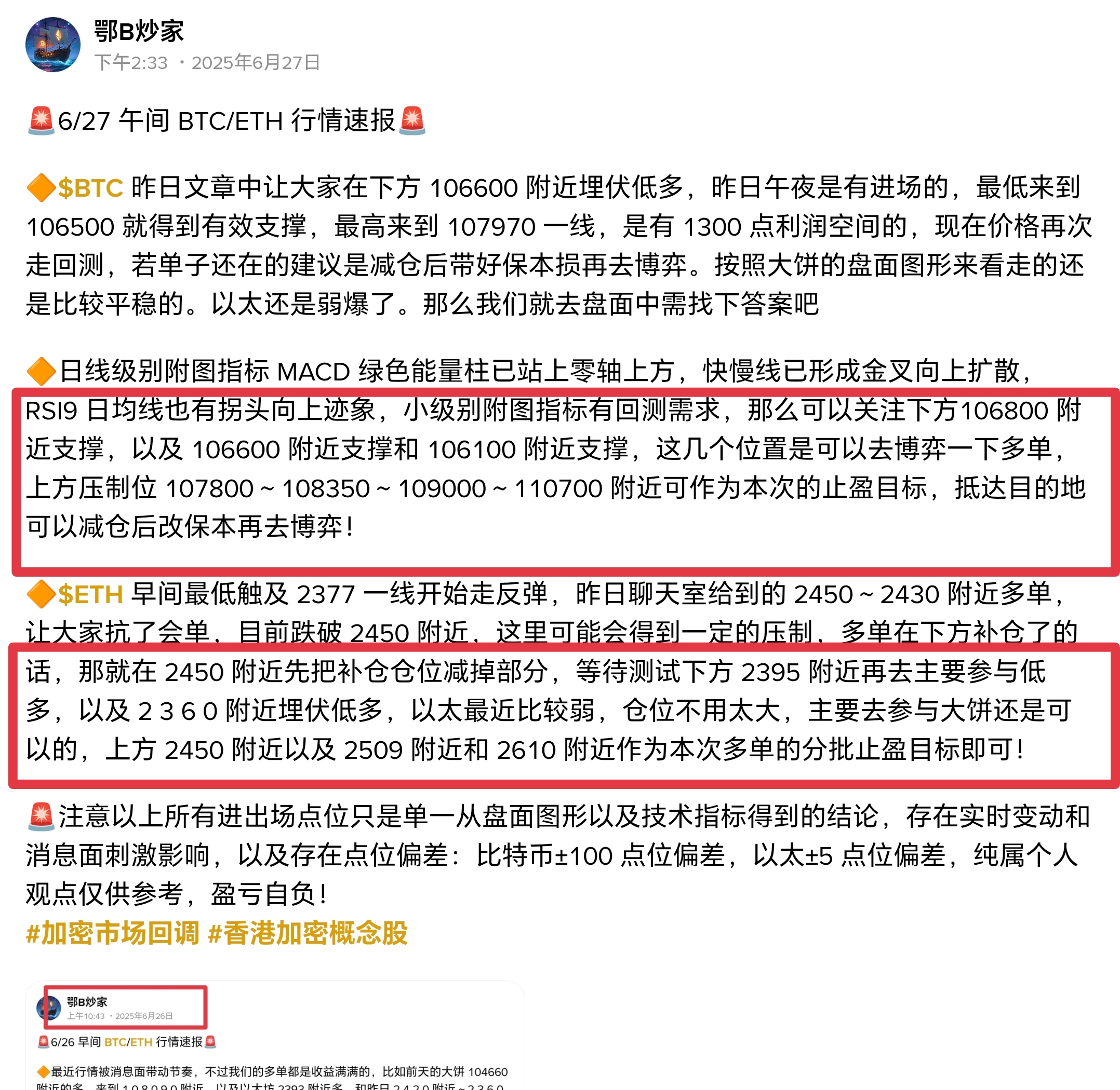 🚨6/27 午间 BTC/ETH 行情速报🚨 🔶$BTC 昨日文章中让大家在下方 106600 附近埋伏低多,昨日午夜是有进场的,最低来到 106500 就得到有效支撑,最高来到 107970 一线,是有 1300 点利润空间的,现在价格再次走回测,若单子还在的建议是减仓后带好保本损再去博弈。按照大饼的盘面图形来看走的还是比较平稳的。以太还是弱爆了。那么我们就去盘面中需找下答案吧 🔶日线级别附图指标 MACD 绿色能量柱已站上零轴上方,快慢线已形成金叉向上扩散,RSI9 日均线也有拐头向上迹象,小级别附图指标有回测需求,那么可以关注下方106800 附近支撑,以及 106600 附近支撑和 106100 附近支撑,这几个位置是可以去博弈一下多单,上方压制位 107800~108350~109000~110700 附近可作为本次的止盈目标,抵达目的地可以减仓后改保本再去博弈! 🔶$ETH 早间最低触及 2377 一线开始走反弹,昨日聊天室给到的 2450~2430 附近多单,让大家抗了会单,目前跌破 2450 附近,这里可能会得到一定的压制,多单在下方补仓了的话,那就在 2450 附近先把补仓仓位减掉部分,等待测试下方 2395 附近再去主要参与低多,以及 2 3 6 0 附近埋伏低多,以太最近比较弱,仓位不用太大,主要去参与大饼还是可以的,上方 2450 附近以及 2509 附近和 2610 附近作为本次多单的分批止盈目标即可! 🚨注意以上所有进出场点位只是单一从盘面图形以及技术指标得到的结论,存在实时变动和消息面刺激影响,以及存在点位偏差:比特币±100 点位偏差,以太±5 点位偏差,纯属个人观点仅供参考,盈亏自负!