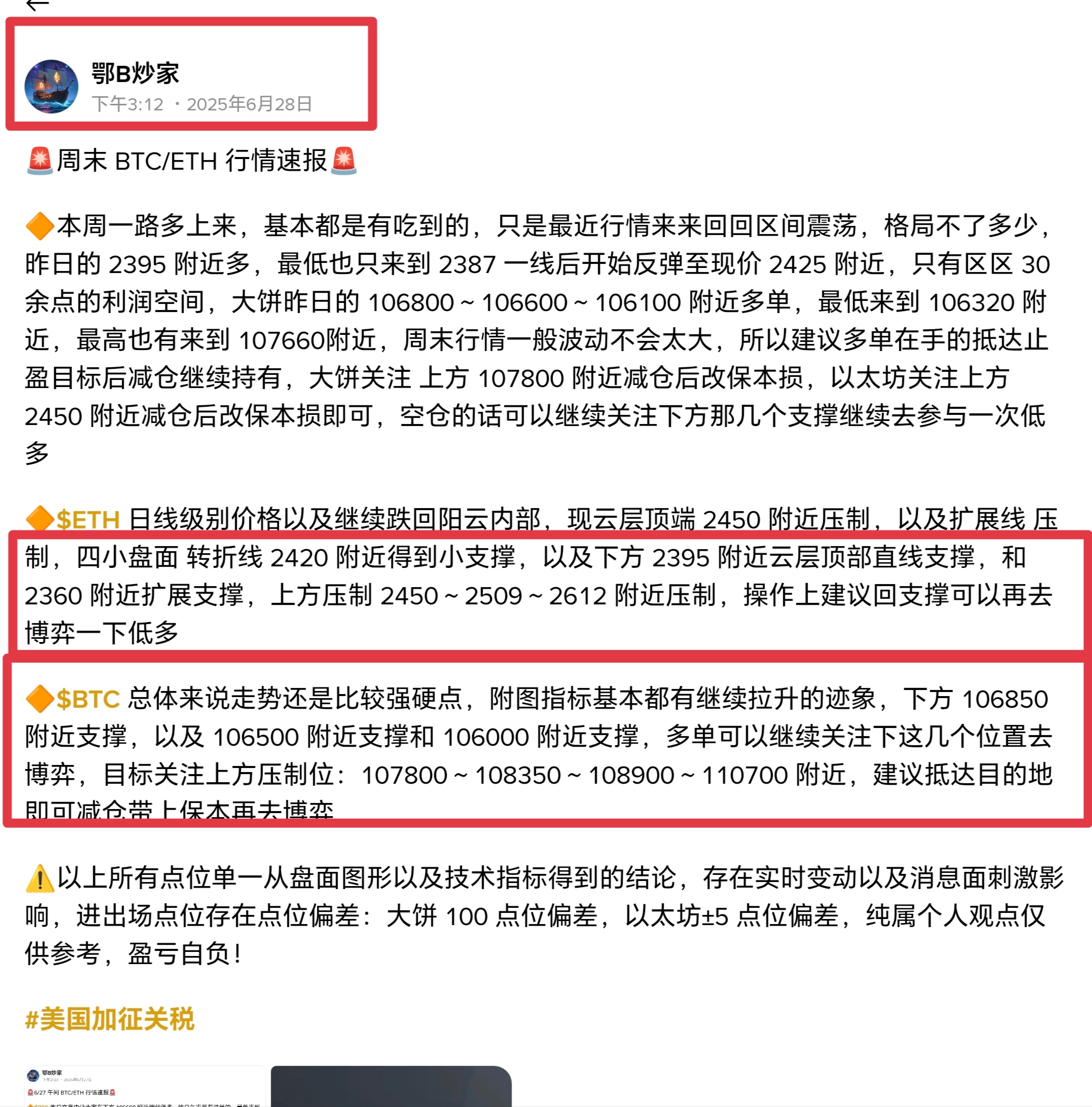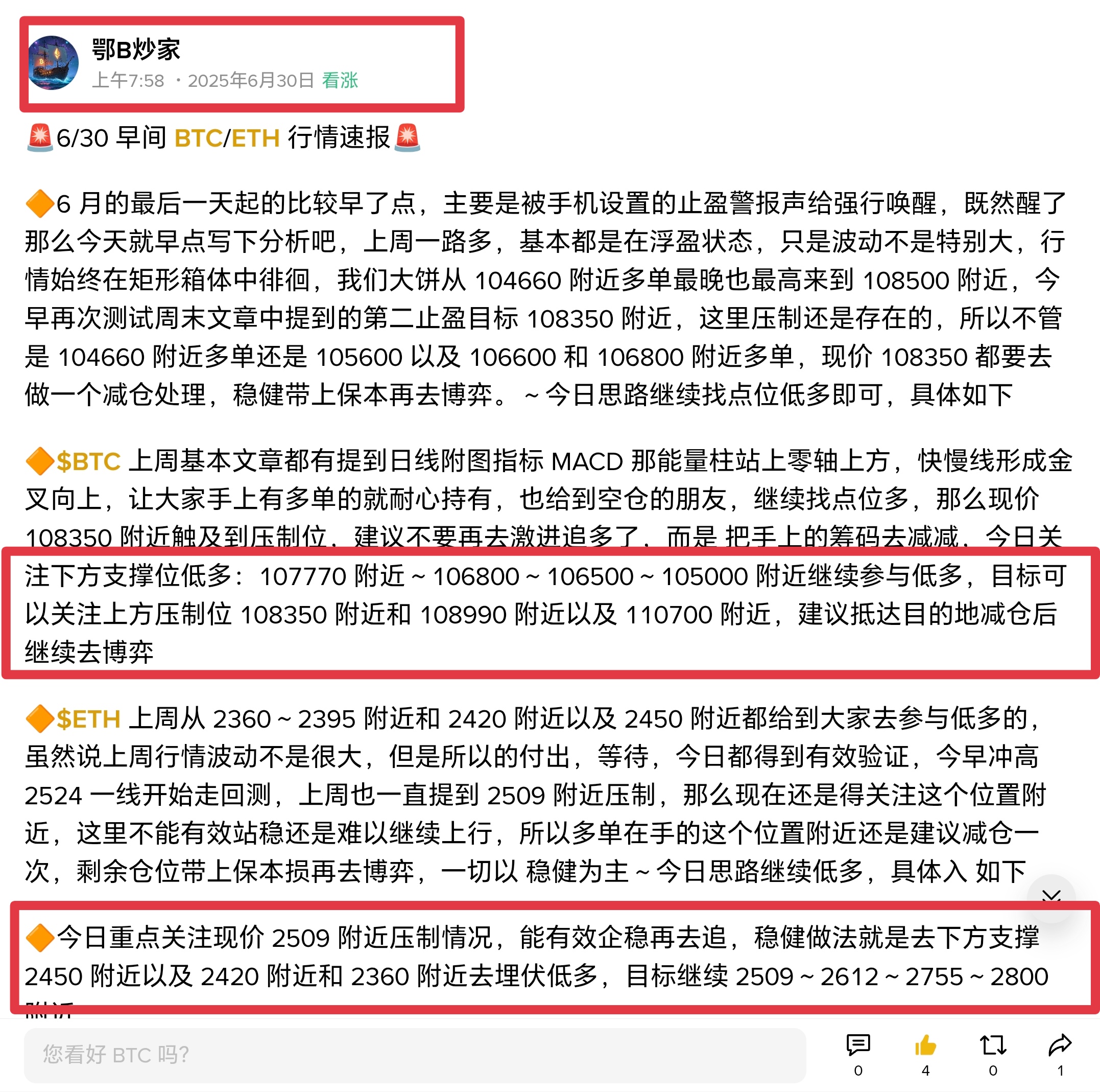 🚨6/30 早间 BTC/ETH 行情速报🚨 🔶6 月的最后一天起的比较早了点,主要是被手机设置的止盈警报声给强行唤醒,既然醒了那么今天就早点写下分析吧,上周一路多,基本都是在浮盈状态,只是波动不是特别大,行情始终在矩形箱体中徘徊,我们大饼从 104660 附近多单最晚也最高来到 108500 附近,今早再次测试周末文章中提到的第二止盈目标 108350 附近,这里压制还是存在的,所以不管是 104660 附近多单还是 105600 以及 106600 和 106800 附近多单,现价 108350 都要去做一个减仓处理,稳健带上保本再去博弈。~今日思路继续找点位低多即可,具体如下 🔶$BTC 上周基本文章都有提到日线附图指标 MACD 那能量柱站上零轴上方,快慢线形成金叉向上,让大家手上有多单的就耐心持有,也给到空仓的朋友,继续找点位多,那么现价 108350 附近触及到压制位,建议不要再去激进追多了,而是 把手上的筹码去减减,今日关注下方支撑位低多:107770 附近~106800~106500~105000 附近继续参与低多,目标可以关注上方压制位 108350 附近和 108990 附近以及 110700 附近,建议抵达目的地减仓后继续去博弈 🔶$ETH 上周从 2360~2395 附近和 2420 附近以及 2450 附近都给到大家去参与低多的,虽然说上周行情波动不是很大,但是所以的付出,等待,今日都得到有效验证,今早冲高 2524 一线开始走回测,上周也一直提到 2509 附近压制,那么现在还是得关注这个位置附近,这里不能有效站稳还是难以继续上行,所以多单在手的这个位置附近还是建议减仓一次,剩余仓位带上保本损再去博弈,一切以 稳健为主~今日思路继续低多,具体入 如下 🔶今日重点关注现价 2509 附近压制情况,能有效企稳再去追,稳健做法就是去下方支撑 2450 附近以及 2420 附近和 2360 附近去埋伏低多,目标继续 2509~2612~2755~2800 附近,建议抵达目的地即可减仓带上保本损再去博弈! ⚠️:注意以上进出场点位说明:1 .所有点位只是单一从盘面图形以及技术指标得到的结论,存在实时变动以及消息面影响。2.所有点位存在点位偏差:以太坊±5 点位偏差,比特币±100 点位偏差 ⚠️以上纯属个人观点仅供参考,盈亏