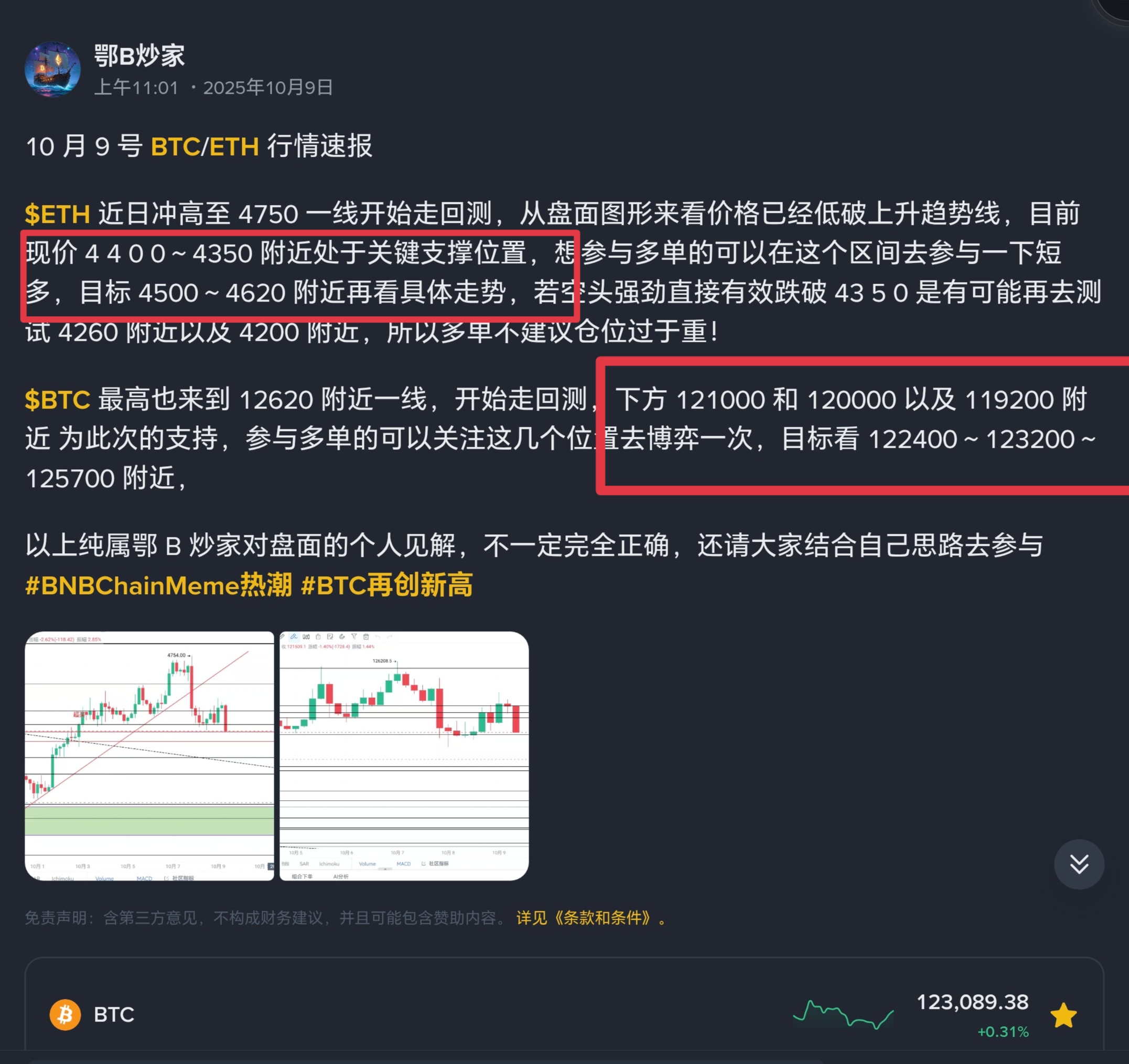 10 月 9 号 BTC/ETH 行情速报 $ETH 近日冲高至 4750 一线开始走回测,从盘面图形来看价格已经跌破上升趋势线,目前 现价 4 4 0 0~4350 附近处于关键支撑位置,想参与多单的可以在这个区间去参与一下短多,目标 4500~4620 附近再看具体走势,若空头强劲直接有效跌破 43 5 0 是有可能再去测试 4260 附近以及 4200 附近,所以多单不建议仓位过于重! $BTC 最高也来到 12620 附近一线,开始走回测,下方 121000 和 120000 以及 119200 附近 为此次的支撑,参与多单的可以关注这几个位置去博弈一次,目标看 122400~123200~125700 附近, 以上纯属鄂 B 炒家对盘面的个人见解,不一定完全正确,还请大家结合自己思路去参与