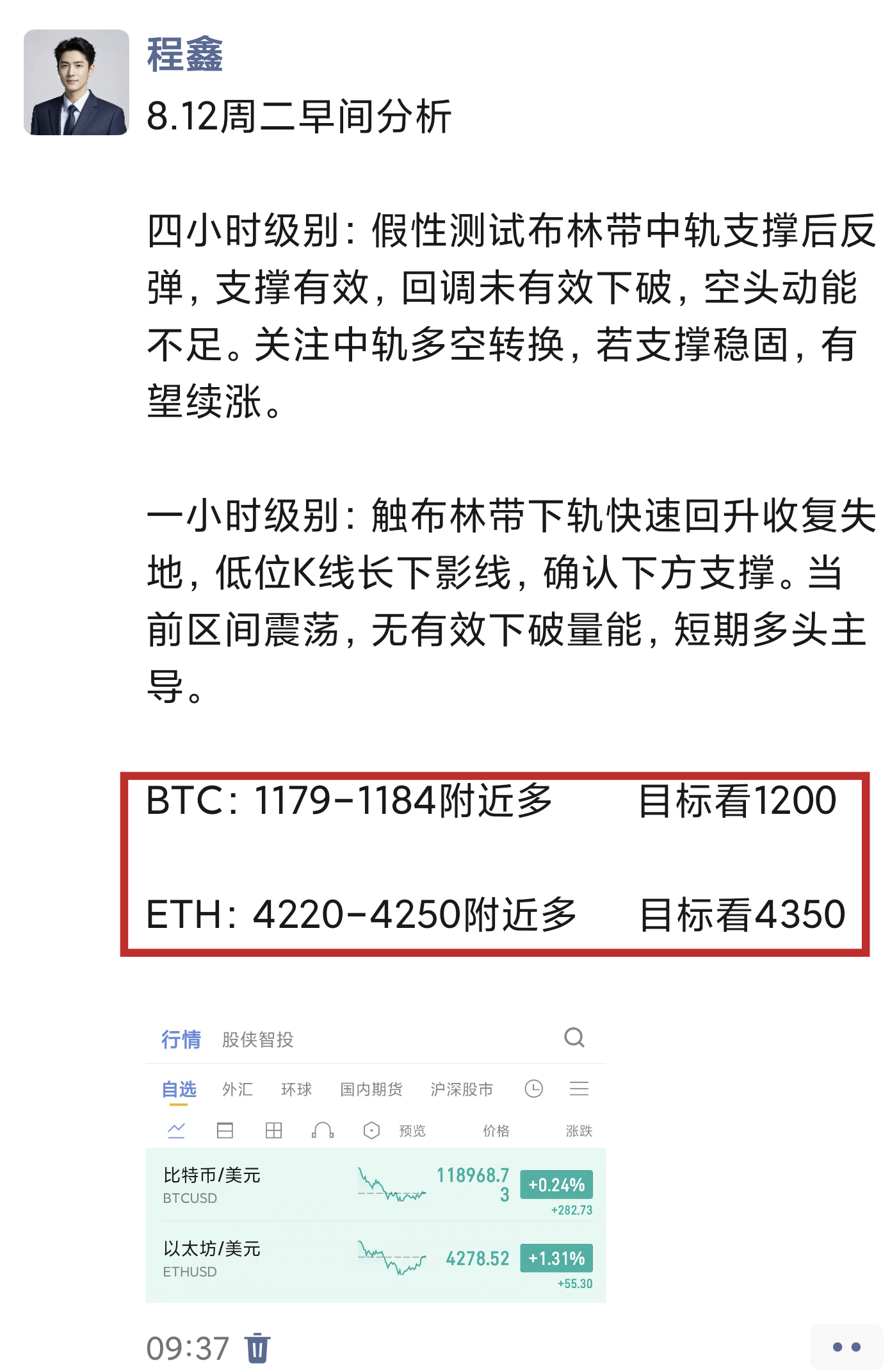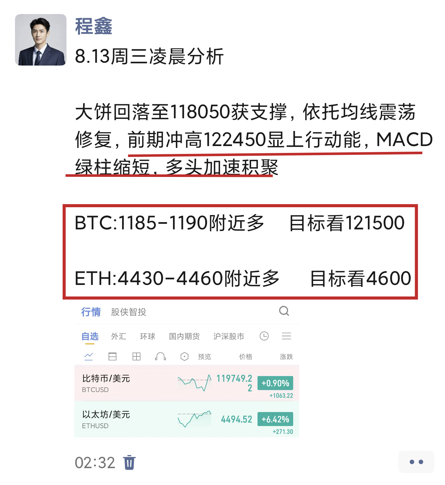 8.13周三凌晨分析 大饼回落至118050获支撑,依托均线震荡修复,前期冲高122450显上行动能,MACD绿柱缩短,多头加速积聚 BTC:1185-1190附近多 目标看121500 ETH:4430-4460附近多 目标看4600
