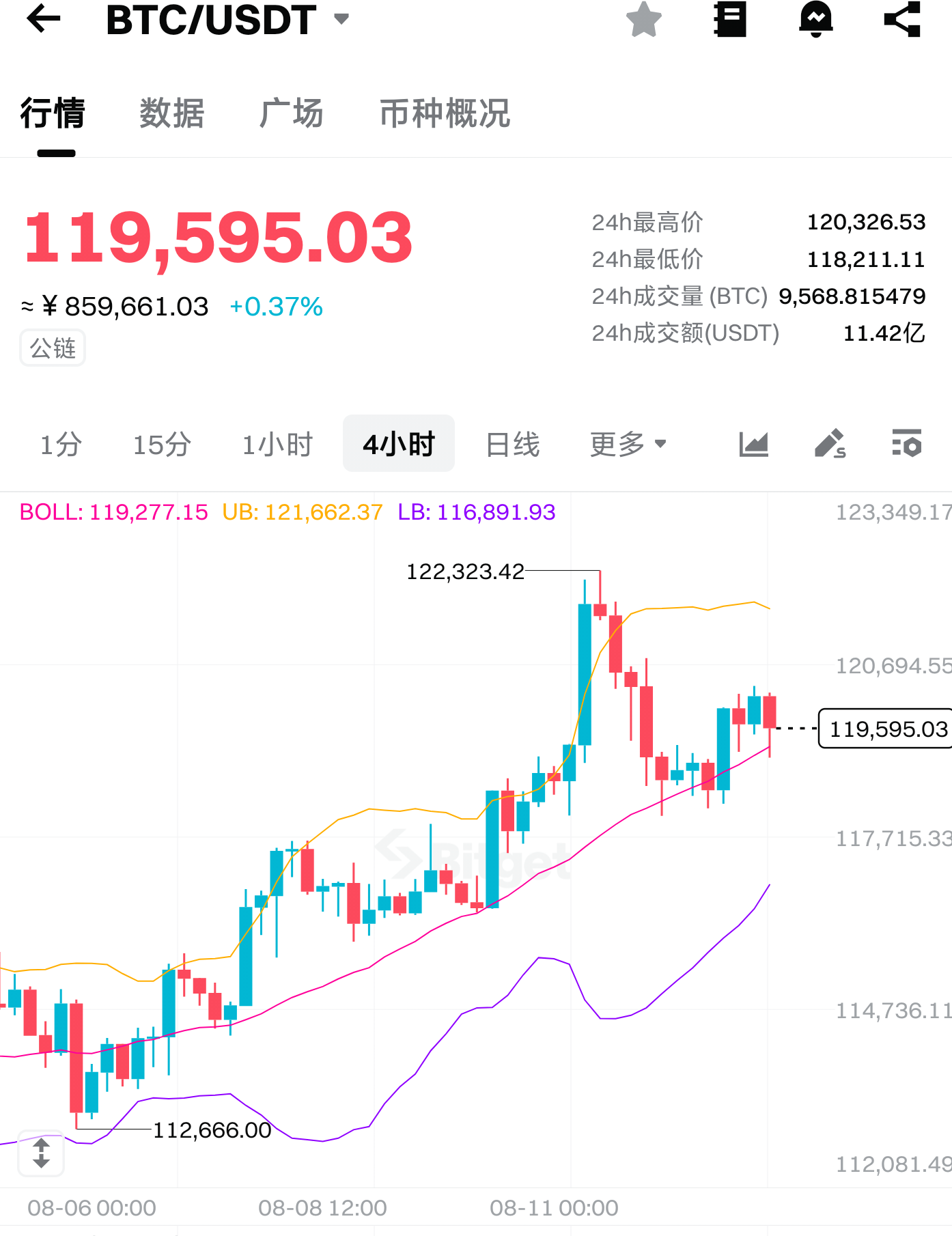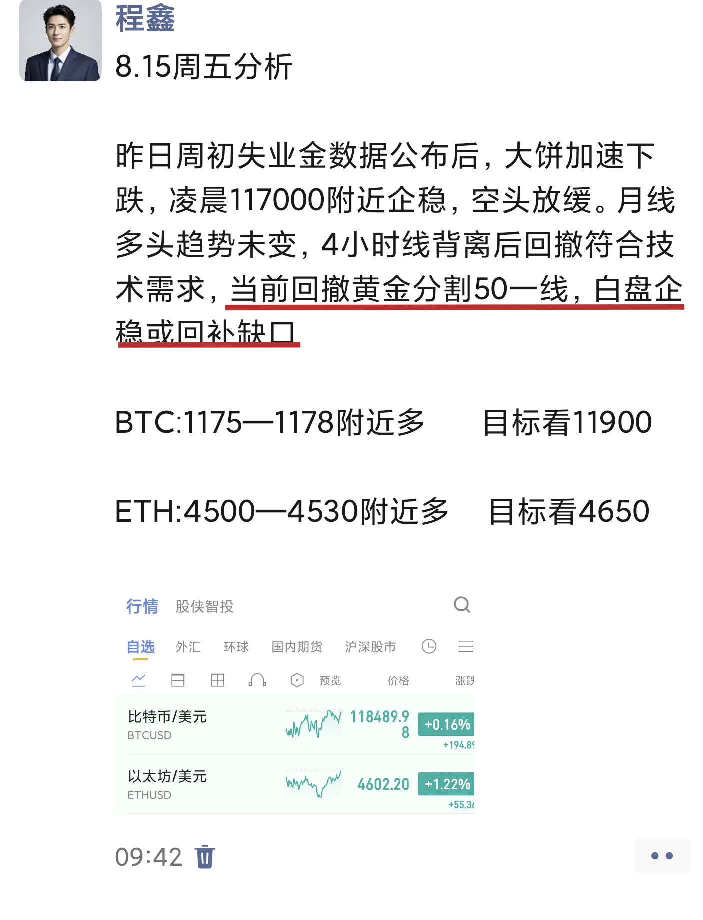 8.15周五分析 昨日周初失业金数据公布后,大饼加速下跌,凌晨117000附近企稳,空头放缓。月线多头趋势未变,4小时线背离后回撤符合技术需求,当前回撤黄金分割50一线,白盘企稳或回补缺口 BTC:1175—1178附近多 目标看11900 ETH:4500—4530附近多 目标看4650