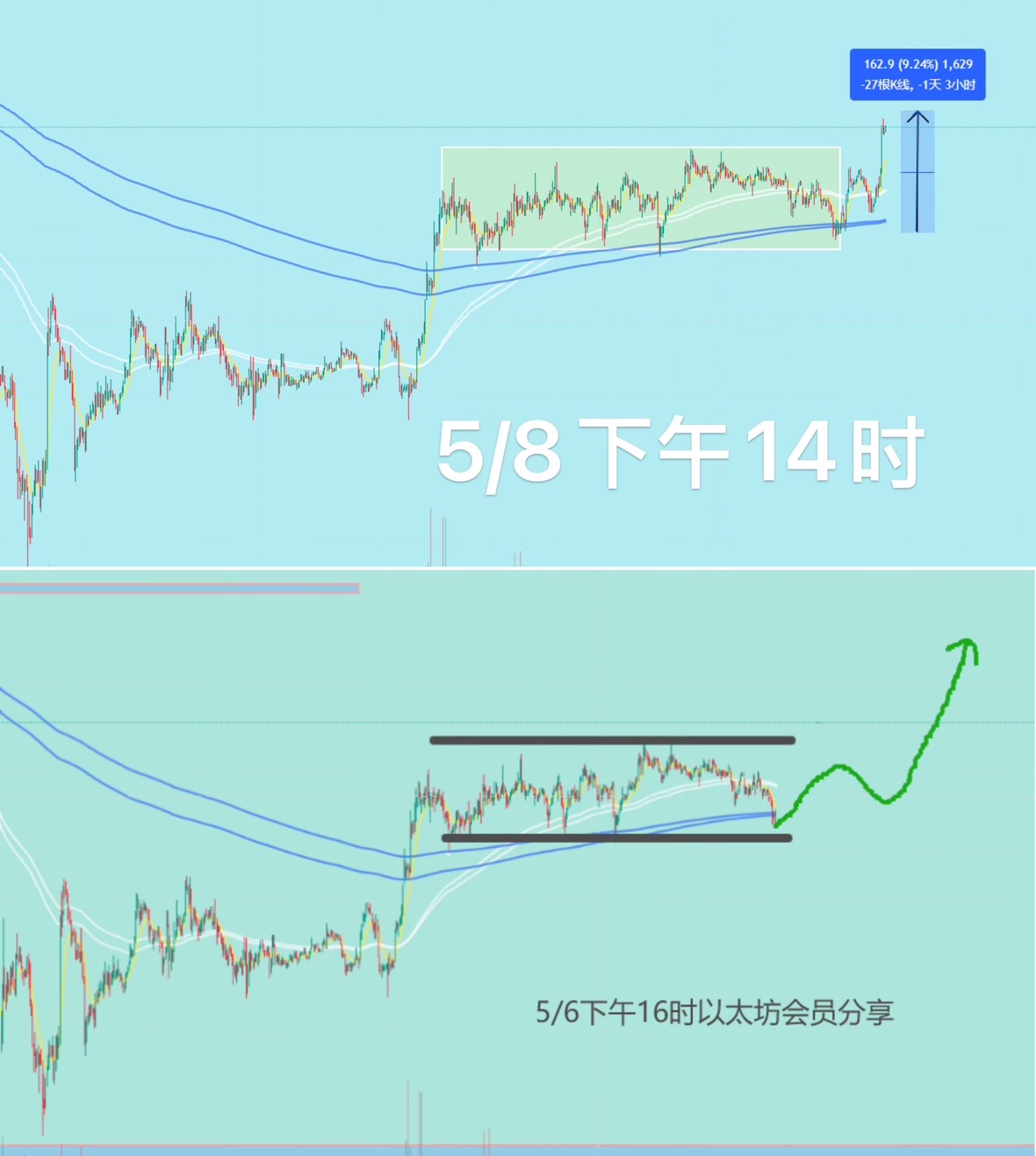 如果是,那么这里可能有短期的换筹需求,考虑会走一段调整来消化,你也可以认为是微观的某种顶部结构。(可以在4h以上级别收影线来判断、还需要观察)