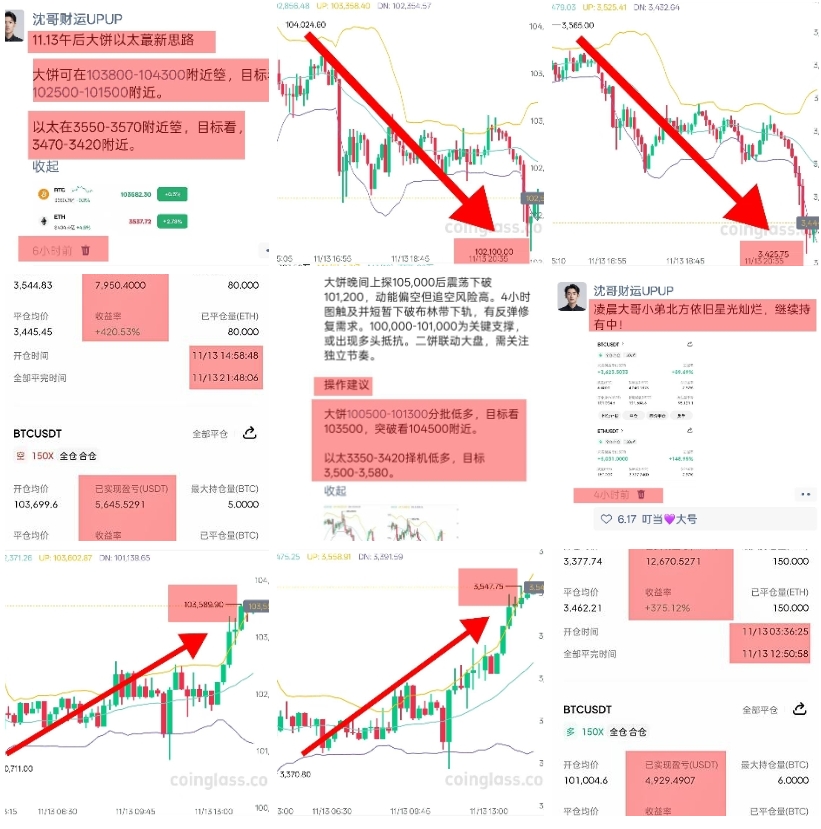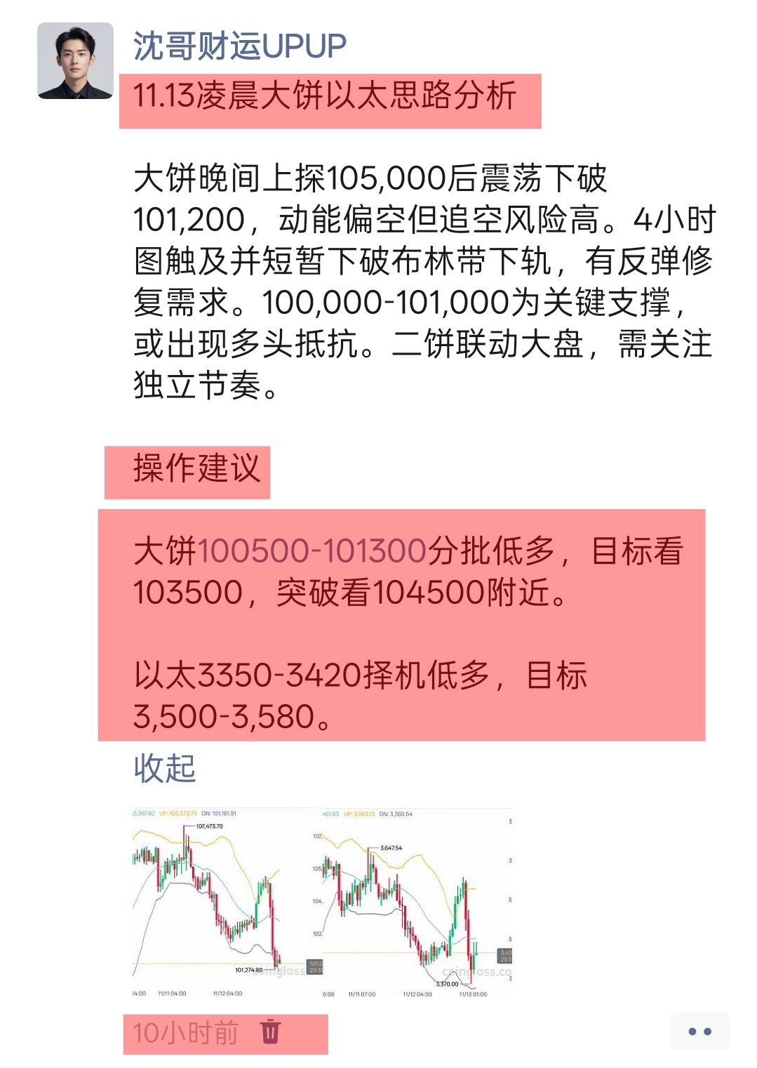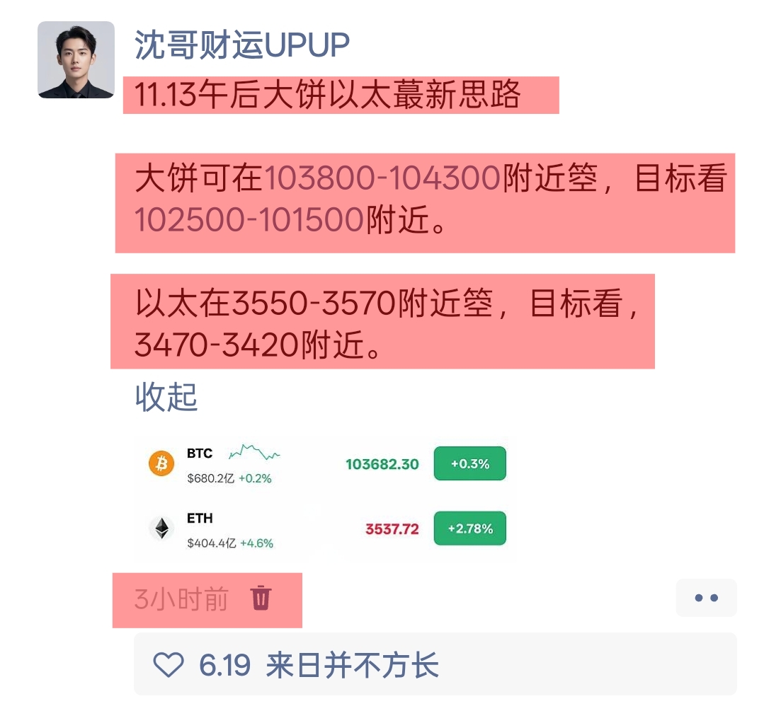11.13午后大饼以太蕞新思路 大饼可在103800-104300附近箜,目标看102500-101500附近。 以太在3550-3570附近箜,目标看,3470-3420附近。