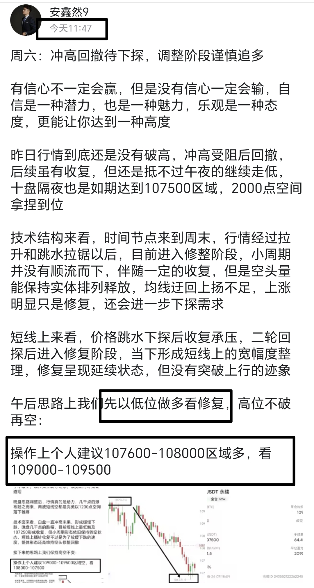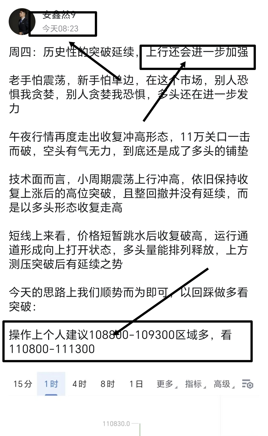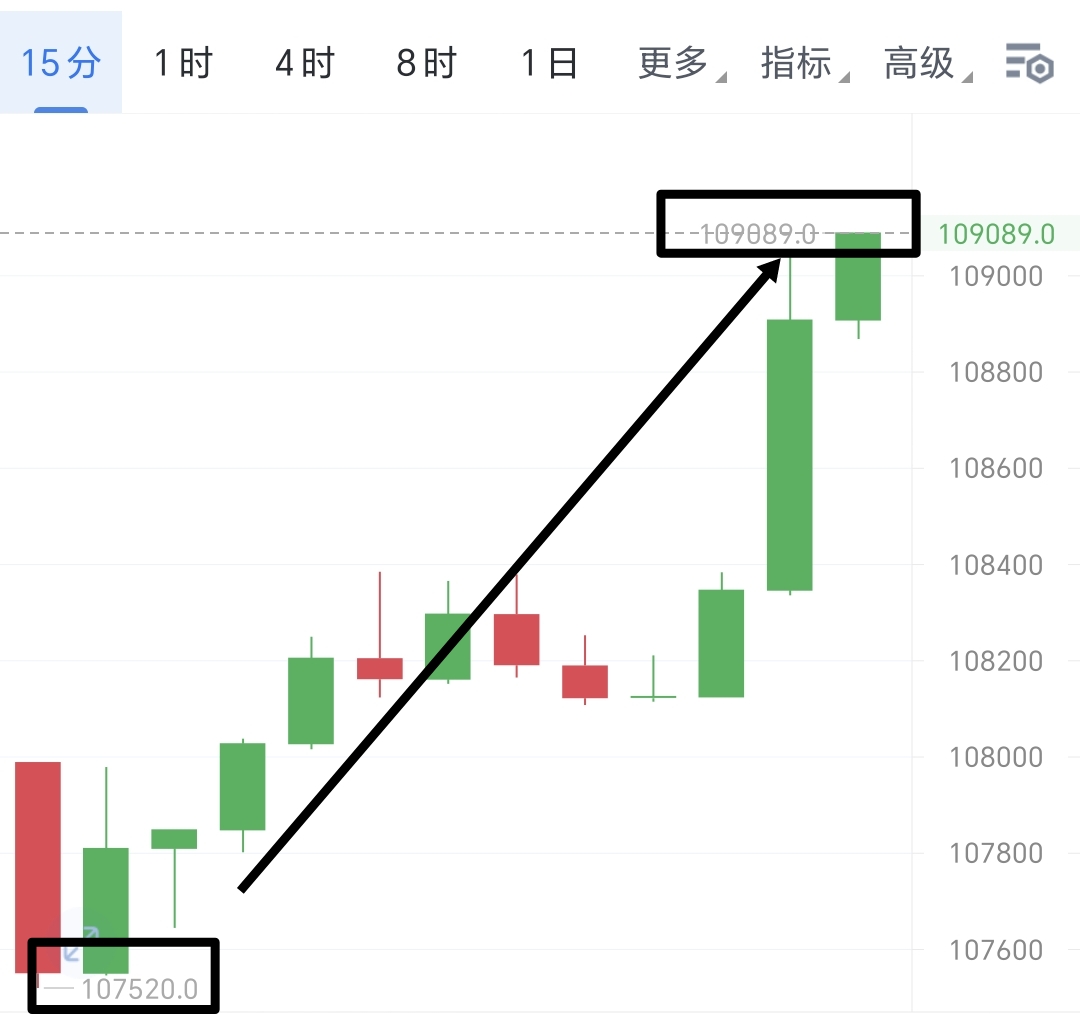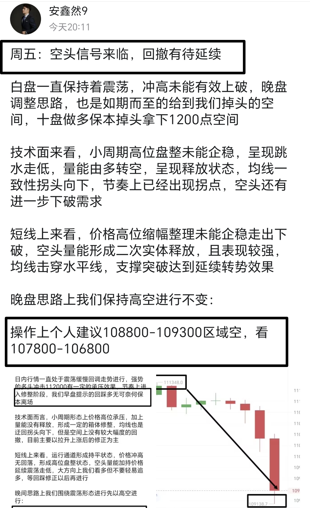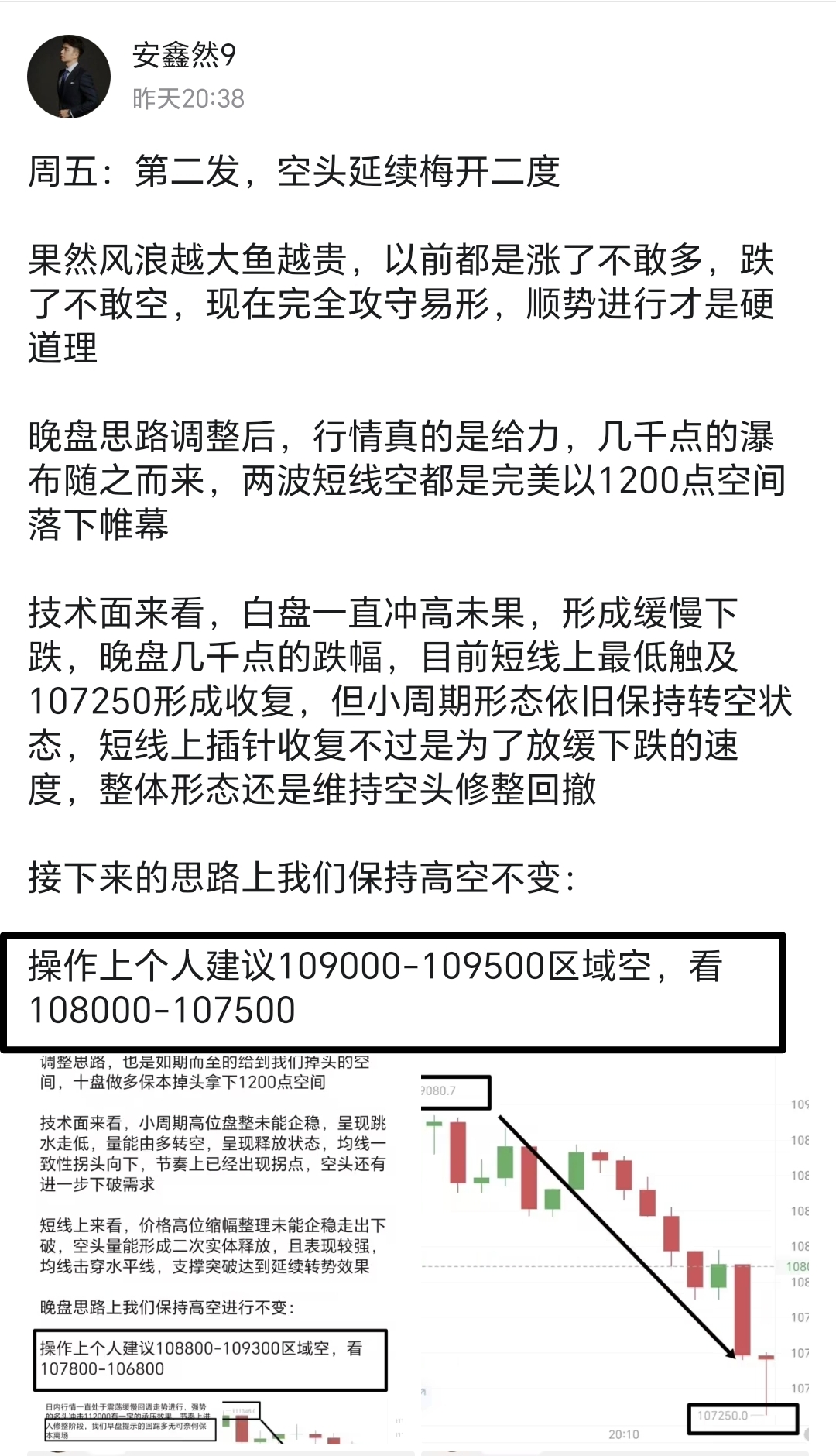 今天行情还是一样,没什么意外,如我们预期一致修复上行,十盘在107800区域多,抵达109000,再度1200点拿捏到位