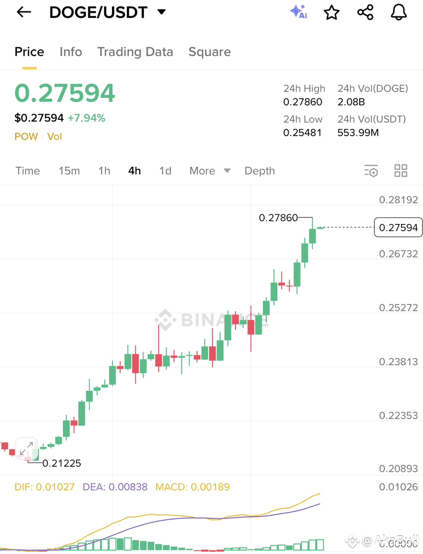 DOGE 今日重回上涨行情,上涨 7.9%。价格一度升至 0.2786,随后略有回落。MACD 动能指标呈上升趋势,显示买家压力稳定。