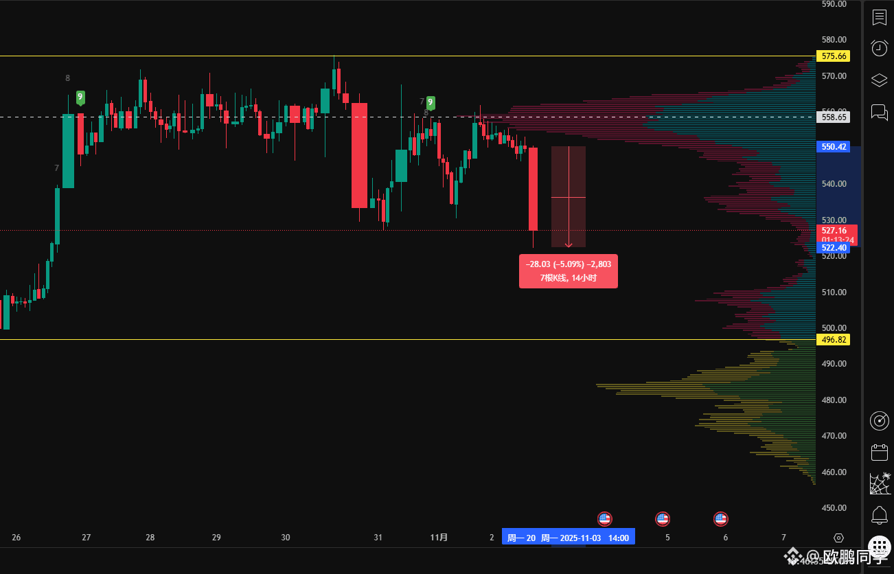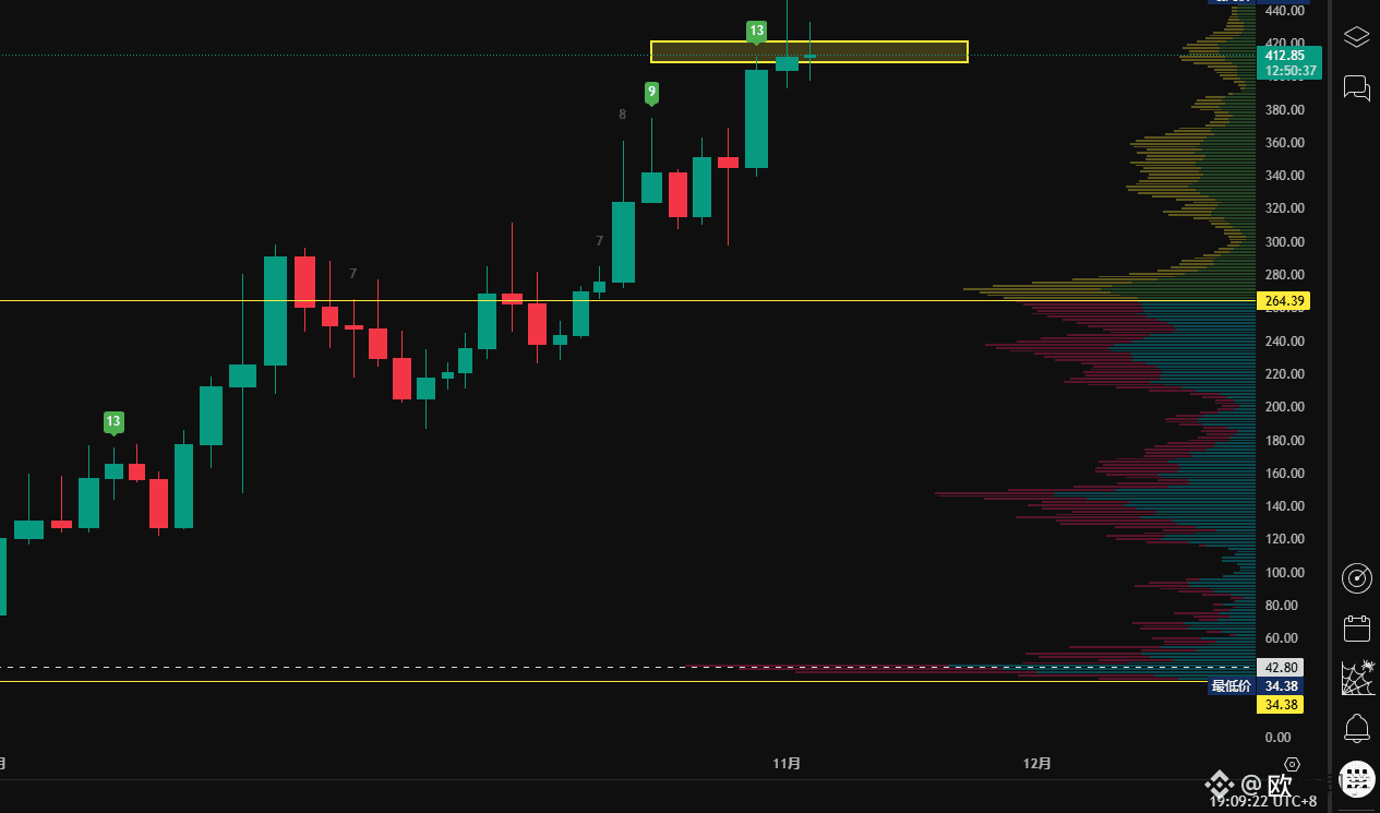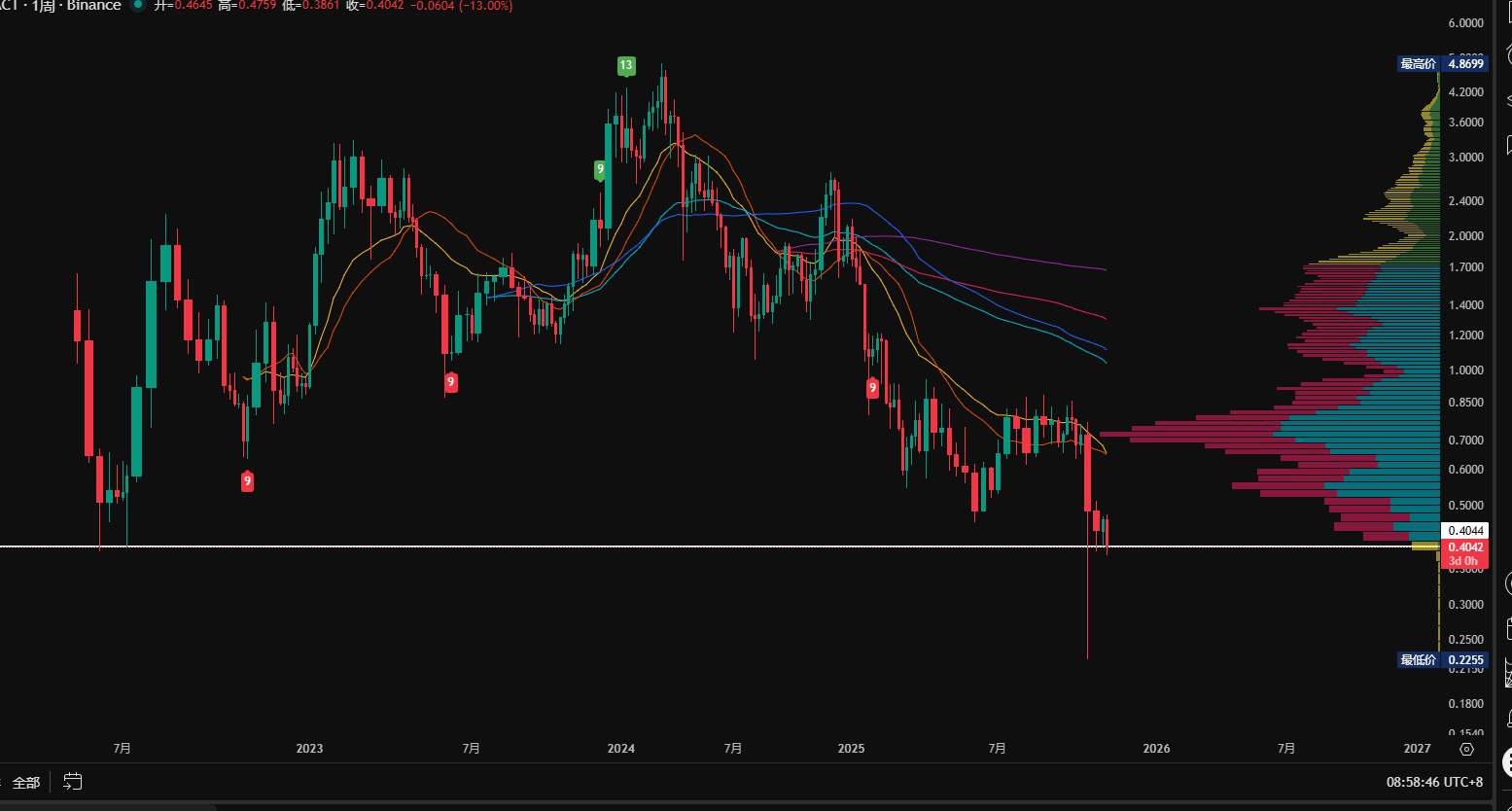 下方强支撑位是0.38附近,也是日线与VPVR重合的关键区间,一旦跌破,下方将直接指向0.35甚至0.32。
