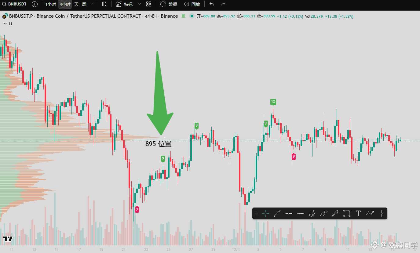 BNB 4小时周期再次尝试突破895关键阻力位,一旦突破价格将站到120天市场成本价之上,4小时周期进入多头趋势!BNB 这一段从低点 790 一路反弹后,没有继续走主升,而是在 880~910 这块反复横盘。横盘最明显的证据就是:20/60 丝带全部缠在一起,线走平、间距很窄——这就像市场在“憋气”,在等一个方向选择。 目前美股盘前小幅在涨,有希望突破这个阻力位。 注意观察 注意观察$BNB {future}(BNBUSDT)
