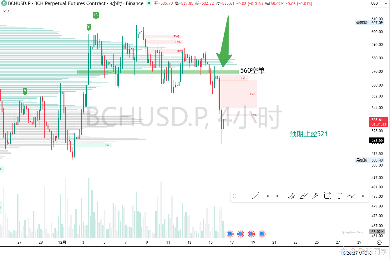 昨天美股盘前在涨,所以22点开播后等待22:30美股开盘后的BNB 多单是否能突破震荡区间做个多单,很显然没有等到。然后立即开了BCH 560的空单。 ,都写了预期521止盈结果BCH快速插针怕利润回撤止盈了,然后错失2/3利润。。 “做交易不难,技术也不难,难得是人性”果真如此