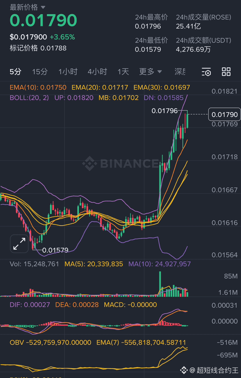 做多$ROSE 入场:0.01770 ~ 0.01780 目标1:0.01820 目标2:0.01860 目标3:0.01900 止损:0.01750 $ROSE EMA短期均线(10/20/30)呈陡峭多头排列。 OBV指标大幅飙升并向上穿越其7日EMA,资金流入迹象非常明显。 布林带开口向上,价格紧贴上轨运行。 {future}(ROSEUSDT)
