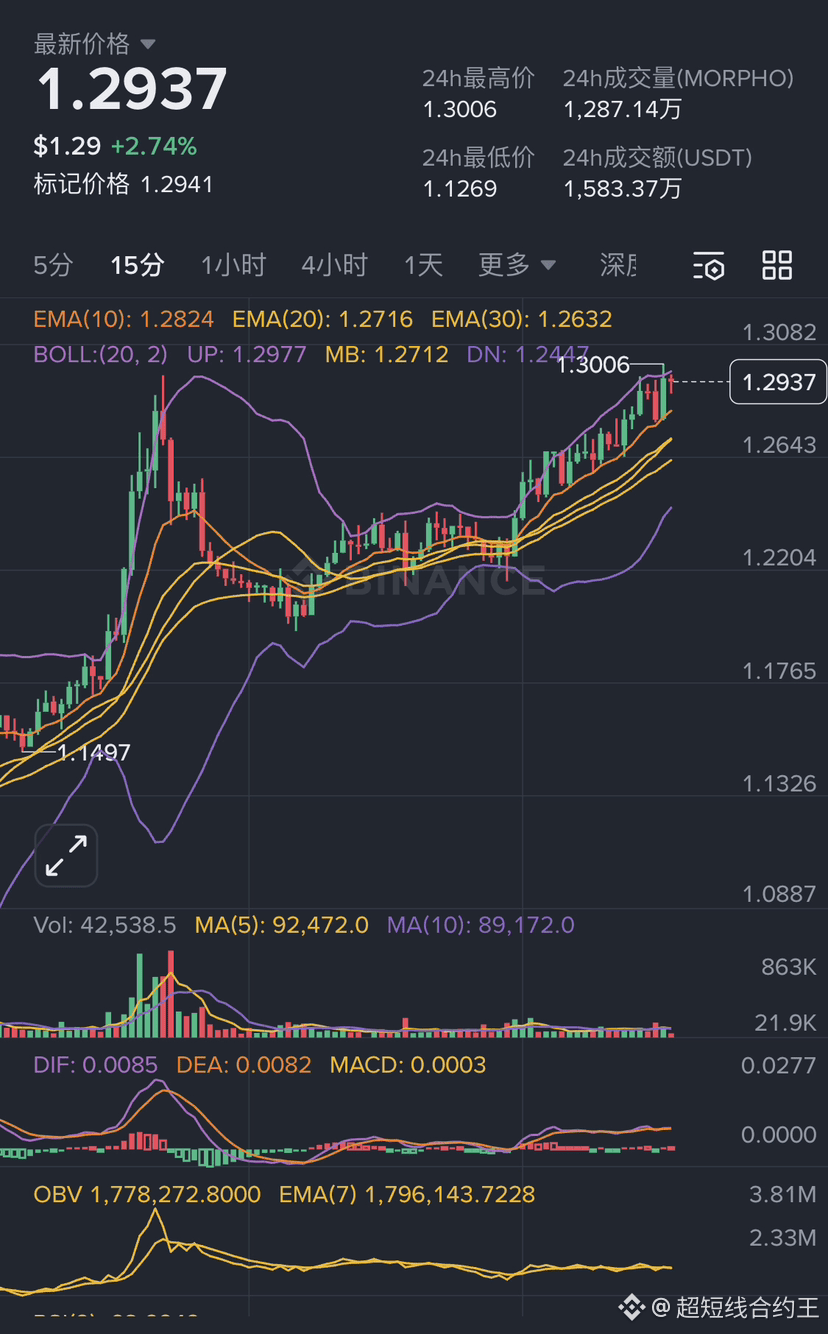 $MORPHO 入场:1.2850 ~ 1.2900 目标1:1.3100 目标2:1.3300 目标3:1.3500 止损:1.2750 $MORPHO 价格已从最低点1.1269反弹超14%,EMA短期均线(10/20/30)呈多头排列并持续向上发散。 MACD红柱持续放大,DIF线在DEA线之上。 OBV指标稳步回升并接近其7日EMA,显示资金持续流入。 {future}(MORPHOUSDT)