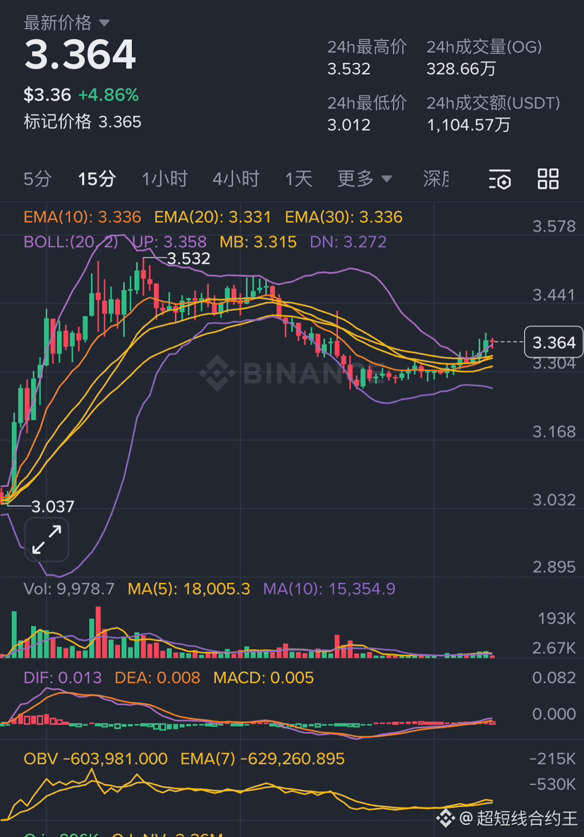 做多$OG 入场:3.340 ~ 3.360 目标1:3.450 目标2:3.550 目标3:3.650 止损:3.300 $OG 价格已从最低点3.012反弹超11.7%,站稳EMA短期均线(10/20/30)。 MACD红柱持续放大,DIF线在DEA线之上。 OBV指标脱离底部并向上穿越其7日EMA,显示资金开始回流。 {future}(OGUSDT)