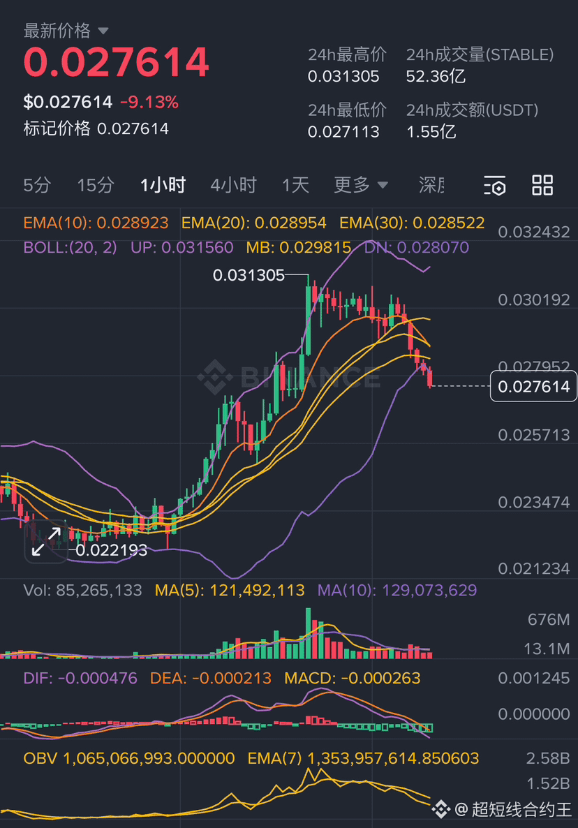做空$STABLE 入场:0.028000 ~ 0.028300 目标1:0.027000 目标2:0.026300 目标3:0.025500 止损:0.028700 $STABLE 价格已跌破EMA短期均线(10/20/30),呈空头排列。 MACD绿柱持续放大,DIF线在DEA线之下。 量能相比上涨阶段明显萎缩。 {future}(STABLEUSDT)