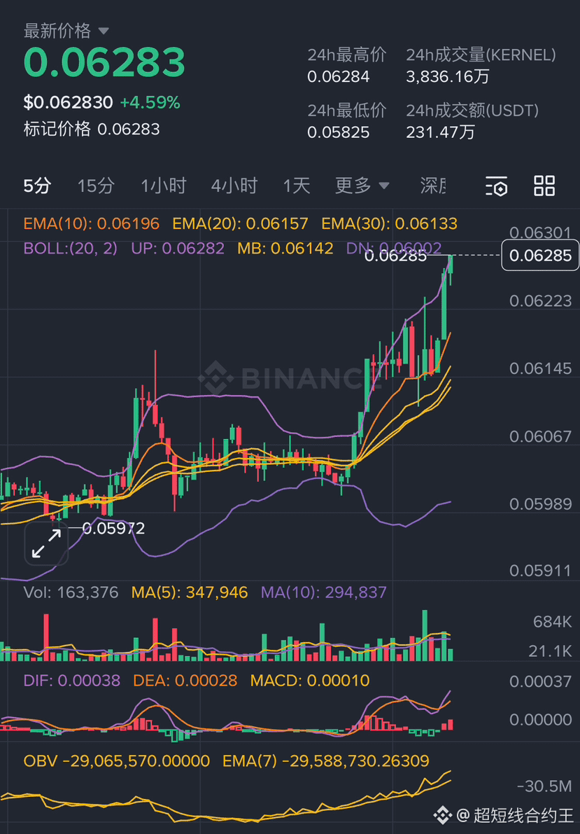 做多$KERNEL 入场:0.06250 ~ 0.06270 目标1:0.06350 目标2:0.06450 目标3:0.06550 止损:0.06210 $KERNEL 价格从最低点0.05825反弹超7.8%,EMA短期均线(10/20/30)呈陡峭多头排列。 OBV指标大幅飙升并向上穿越7日EMA,资金流入迹象非常明显。 布林带开口向上,价格紧贴上轨运行。 {future}(KERNELUSDT)